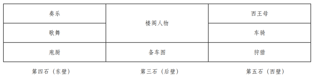 西壁:分六栏。第一栏:女娲、西王母及神仙灵异。第二栏:车骑出行。第三栏:历史故事。第四栏:胡汉战争图。第五栏:狩猎图。第六栏:生活场面。