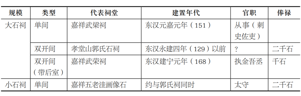 祠堂是用于祭祀的墓前建筑,上自王室贵族、下至地方官僚地主,都建造一定规模的祠堂。尤其在东汉,“孝悌”的格外提倡,厚葬时风的炽盛,祠堂的建造自然也趋附于这种风尚。我们把石祠堂按照它们之间的相对规模,分成大石祠和小石祠。其中大石祠又分为单间石祠、双开间石祠和带后室的双开间的石祠三种。小石祠只有单间石祠一种。列表如下: