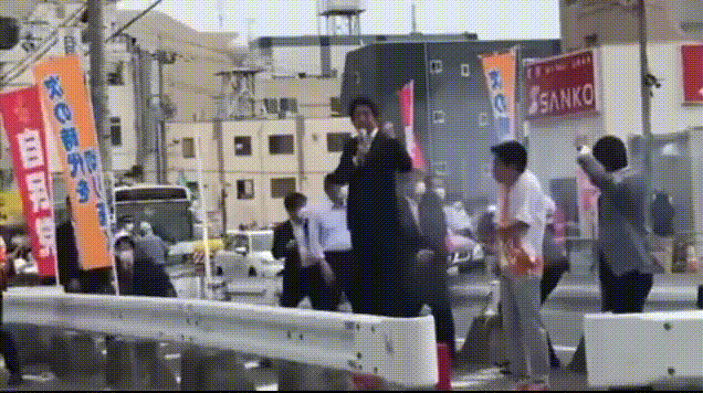 刺杀事发时,安倍隔着条马路背对着凶手,凶手从背后开了2枪,第一枪其实射歪了,当场爆发出巨大的响声和浓烟,而那时安倍晋三的保镖团队也尝试围住安倍晋三,并且其中一人甚至高举自己的公文包来阻挡子弹。