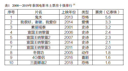 其次是头部影片产生强大的票房号召力,具备了与好莱坞大片抗衡的实力。泰国自20世纪初就实行了较为开放的电影市场政策,电影市场曾长期被好莱坞电影、日本电影和中国香港电影等外来电影势力垄断,票房冠军的宝座常年被好莱坞商业大片占据。进入21世纪,泰国国产的头部电影开始冲击好莱坞电影的霸权地位。除2001年的《素丽瑶泰》之外,2006年的《纳瑞宣国王》、2007年的《纳瑞宣国王2》、2013年的《鬼夫》、2014年的《我很好,谢谢,我爱你》均击败了当年的好莱坞商业巨制,成为年度票房冠军。《鬼夫》更是成为了泰国影史票房最高的电影,其创造的5.6亿泰铢的泰国电影市场单片票房纪录直到2019年才被《复仇者联盟4》打破。史诗片《纳瑞宣国王》从2007年到2015年共拍摄了6部,其中4部成为当年的本土电影票房冠军,《纳瑞宣国王》系列总票房收入超过12亿泰铢,成为泰国21世纪票房收入最高的系列电影(参见下表)。