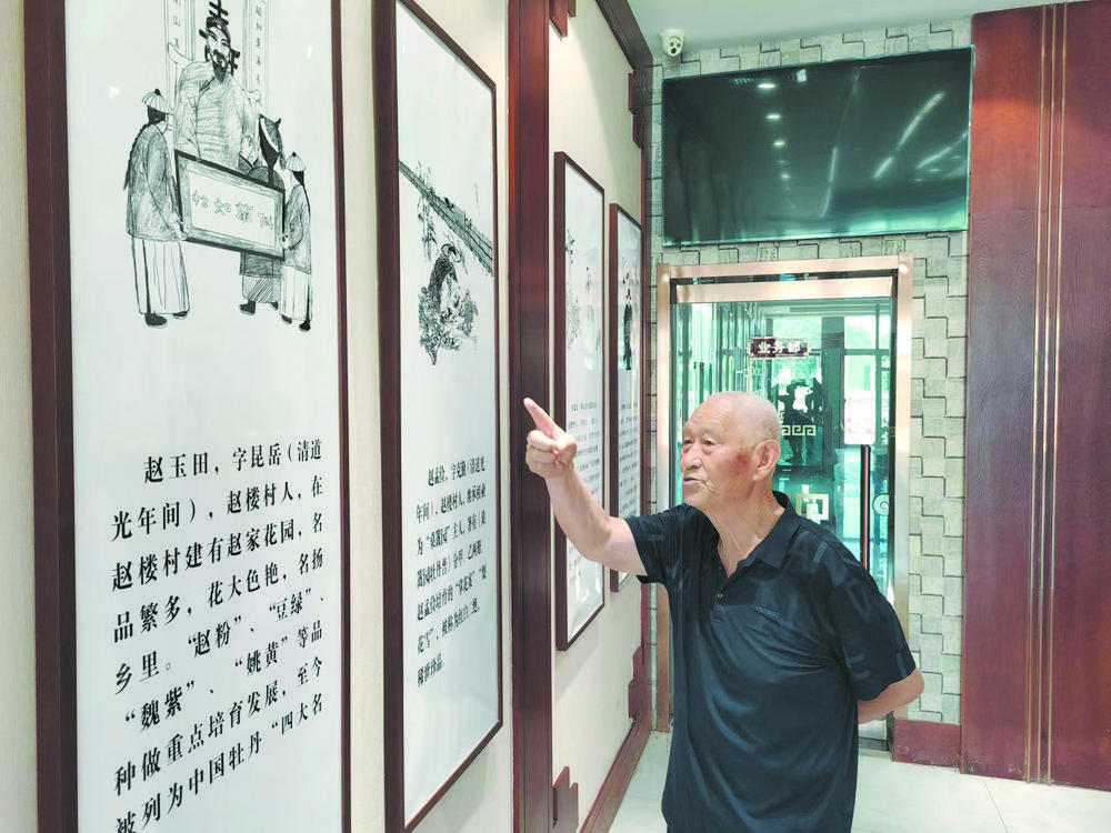 “这幅画描绘的是赵玉田过寿的情景,画中的老人便是赵玉田,几名清兵受马邦举所派给他送来寿匾,寿匾上书写着‘似兰如松’四个大字。”7月16日上午,80岁的牡丹专家赵孝知,向记者讲述赵楼花农赵玉田与曹州府主考官马邦举的故事。