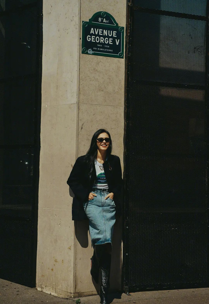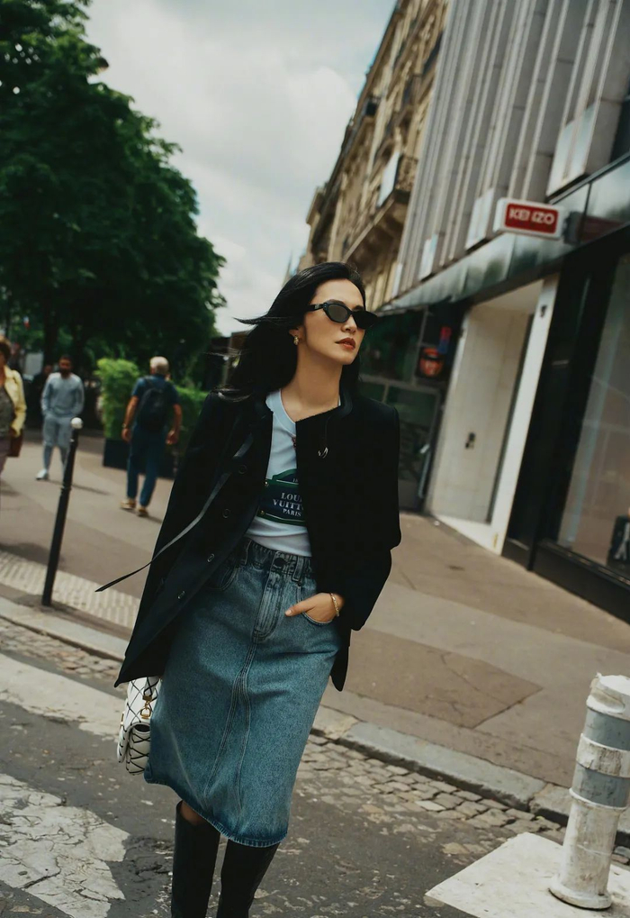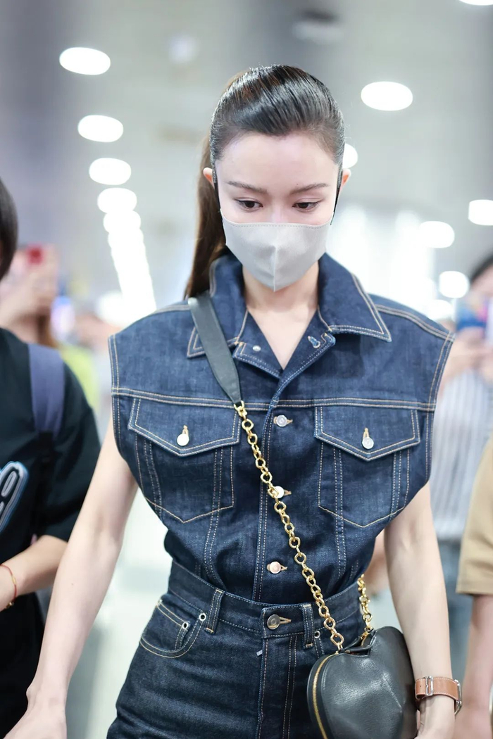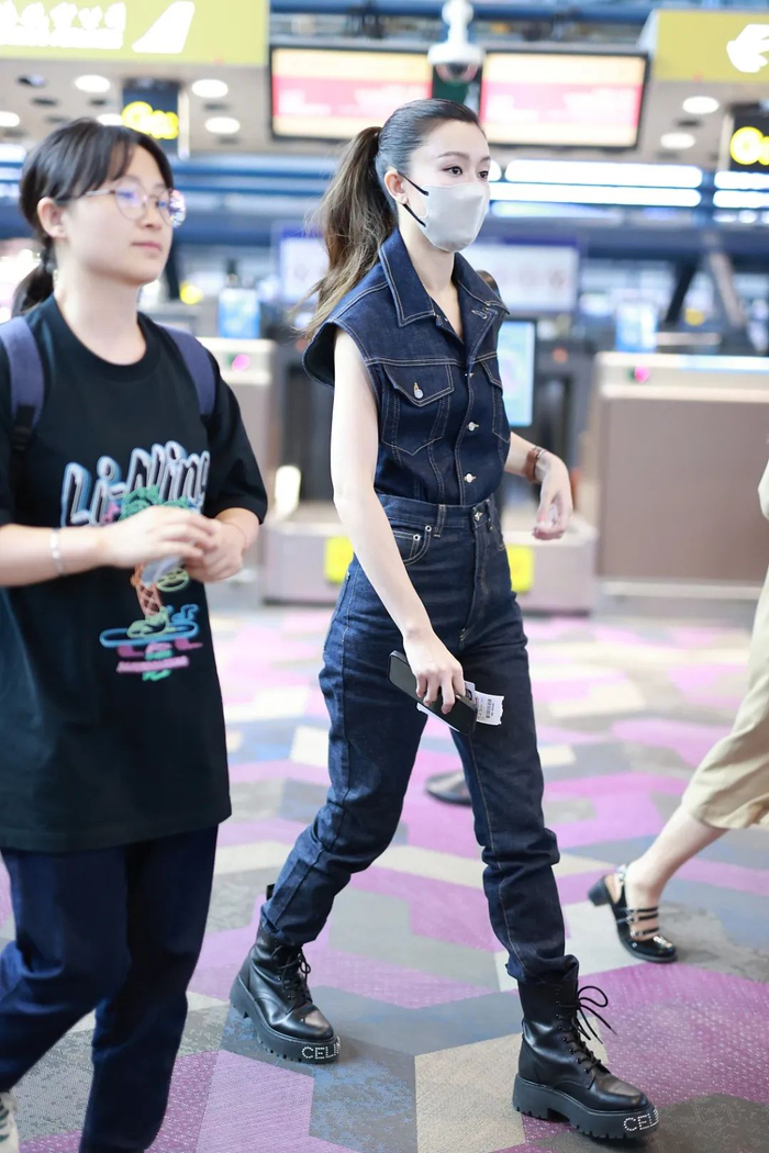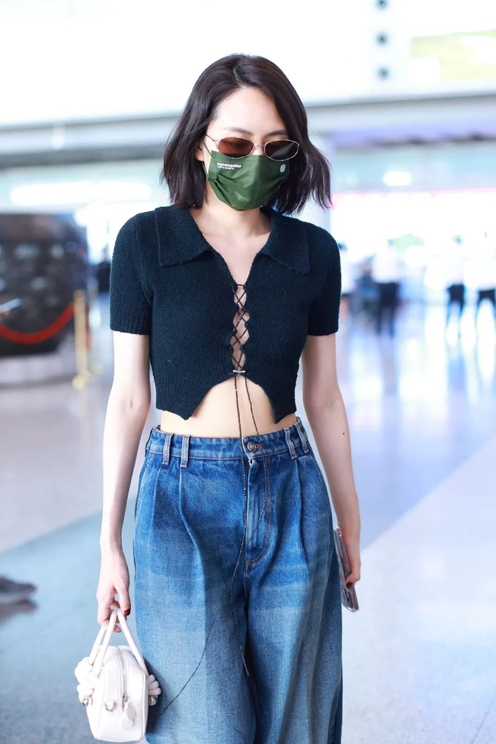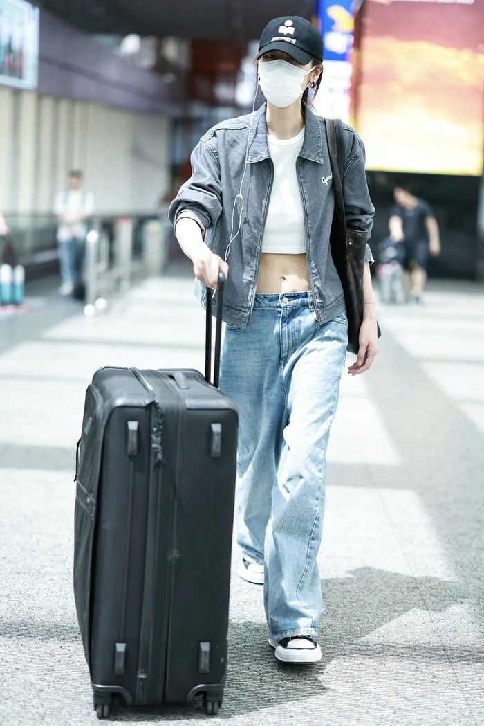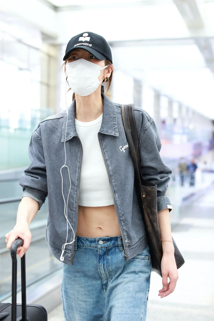 先来看看结束巴黎高定时装周行程回国的大表姐,灰色的牛仔外套蛮少见的,内搭crop top + 宽松牛仔这一经典单品组合,休闲又时髦。