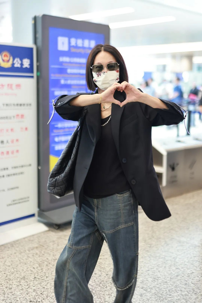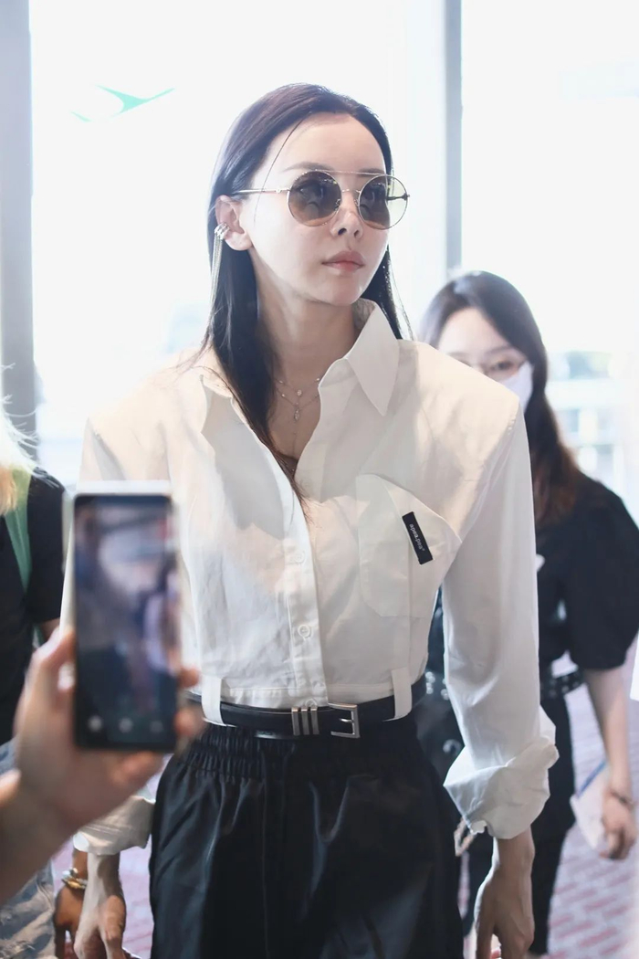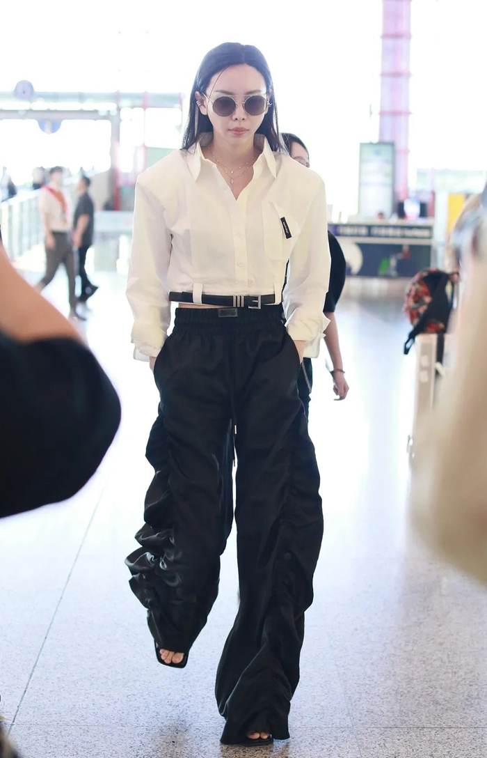 请问文姐是来机场走秀的吗?廓形短款白衬衫和机车风阔腿裤,再搭上着抹了发蜡根根分明的“大背头”,A到爆了!