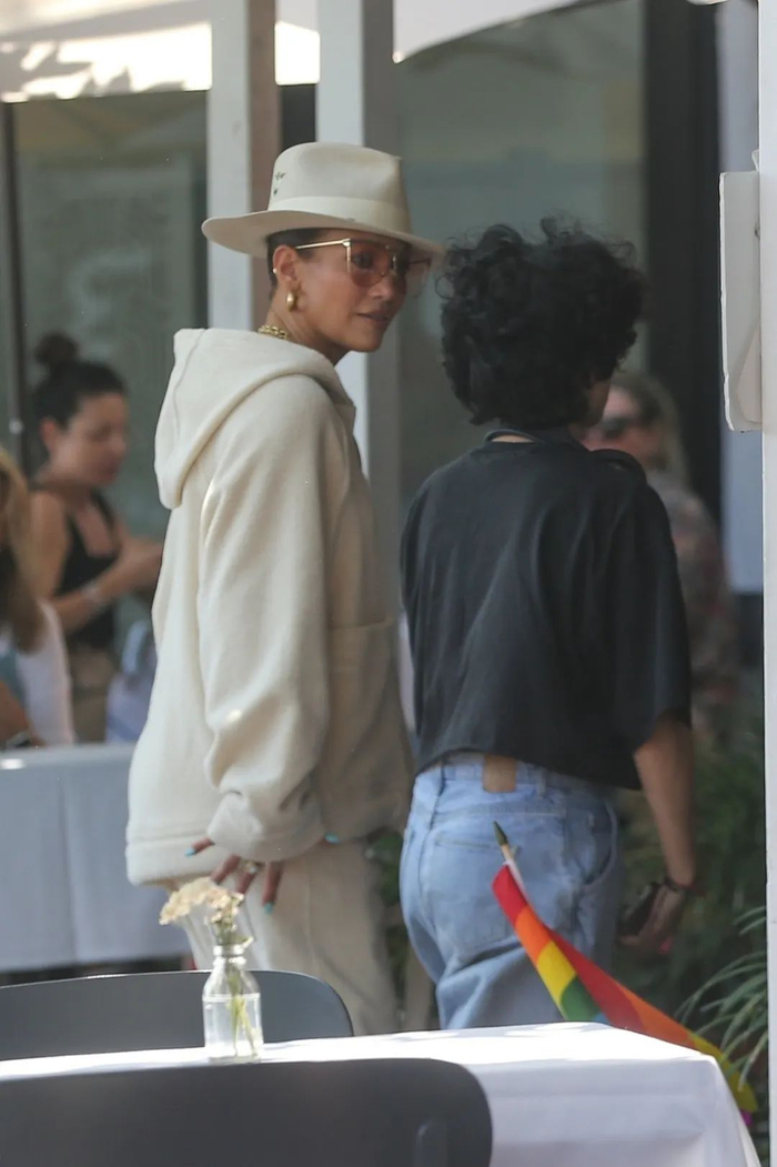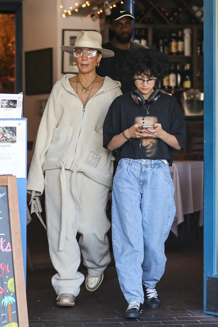 一起午餐的母女两,都有点子hip-hop在身上。J.Lo挂着几条gold chain,就连鞋子都blingbling的;戴着牛仔帽和遮住半张脸的墨镜,拎个嗲到不行的小包包,这就是裸色系的西部女富婆牛仔吧。