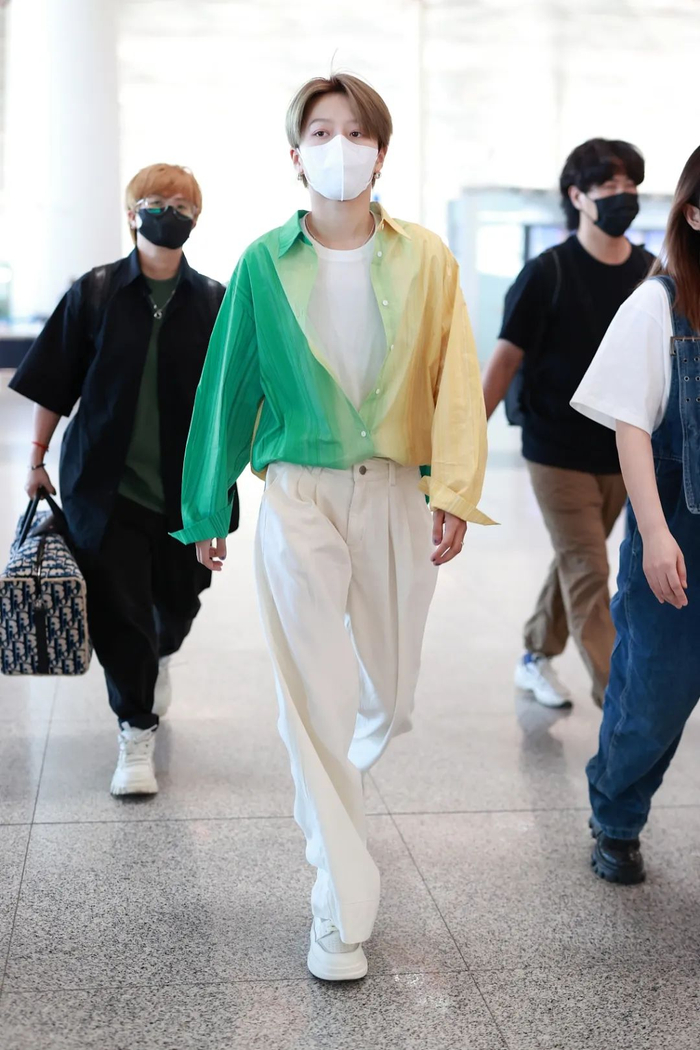 飞澳门参加2023TMEA腾讯音乐娱乐盛典的雨昕,All White 外搭了一件黄绿渐变衬衣,今日份XIN是柠檬味的诶!