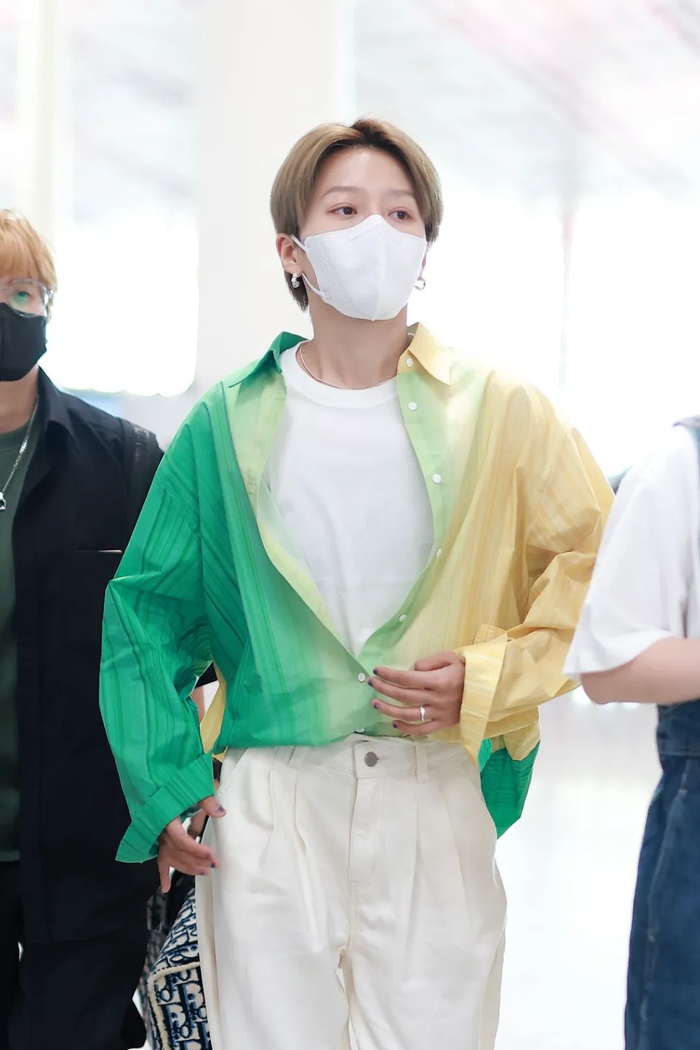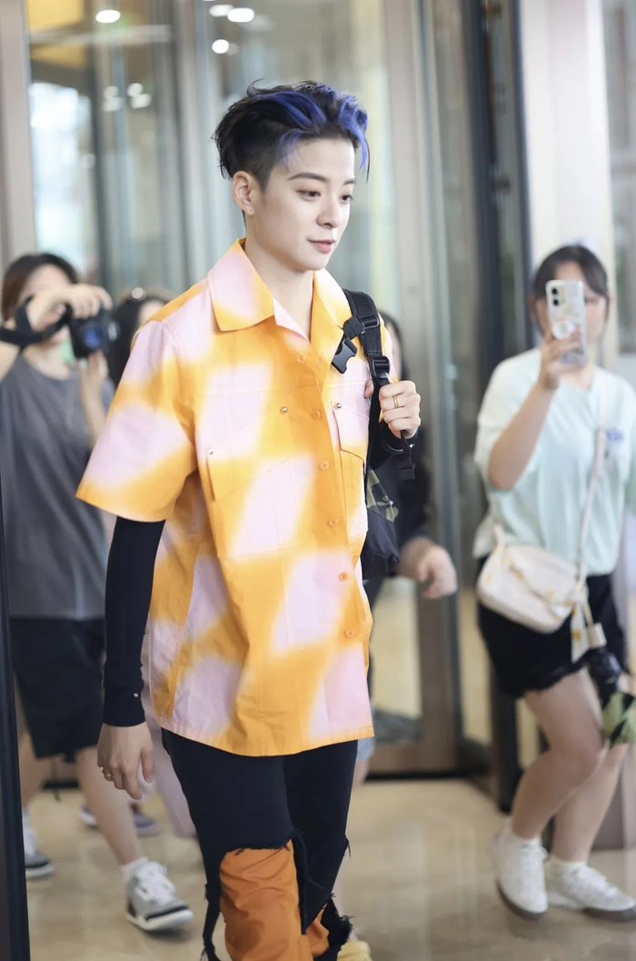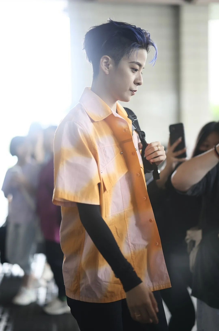 Amber出发前往录制《乘风2023》。这件落日橙的短袖衬衣和她的蓝色挑染发色搭配起来,有点像蓝天和黄昏交际之时,还晕染着点点光斑的感觉(我怎么对着她这么会夸?)