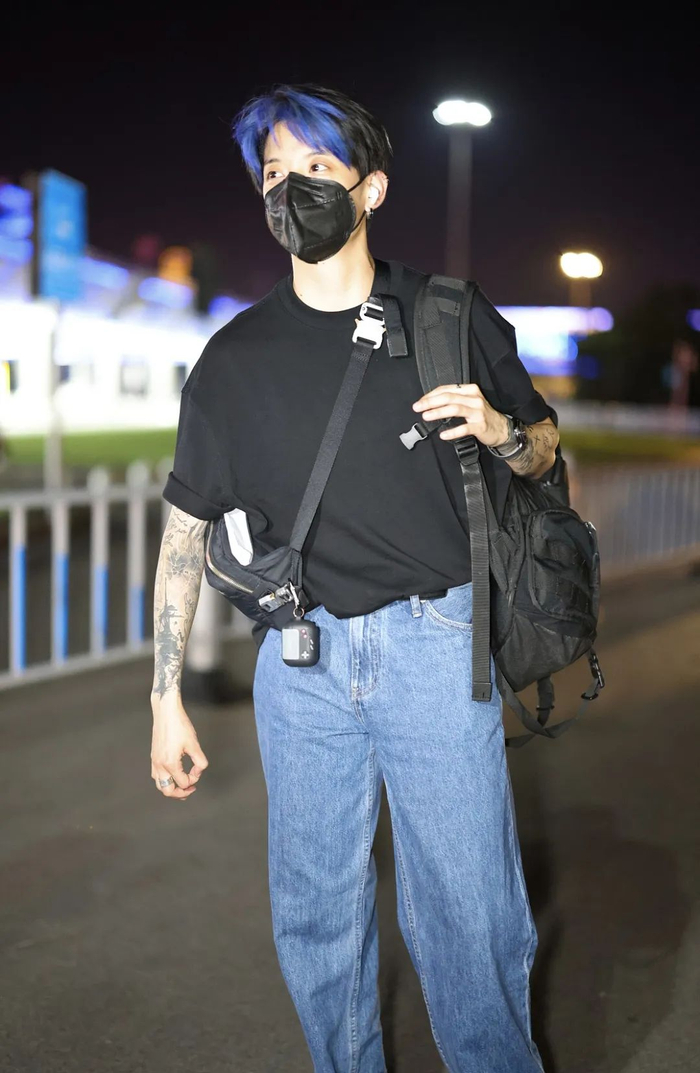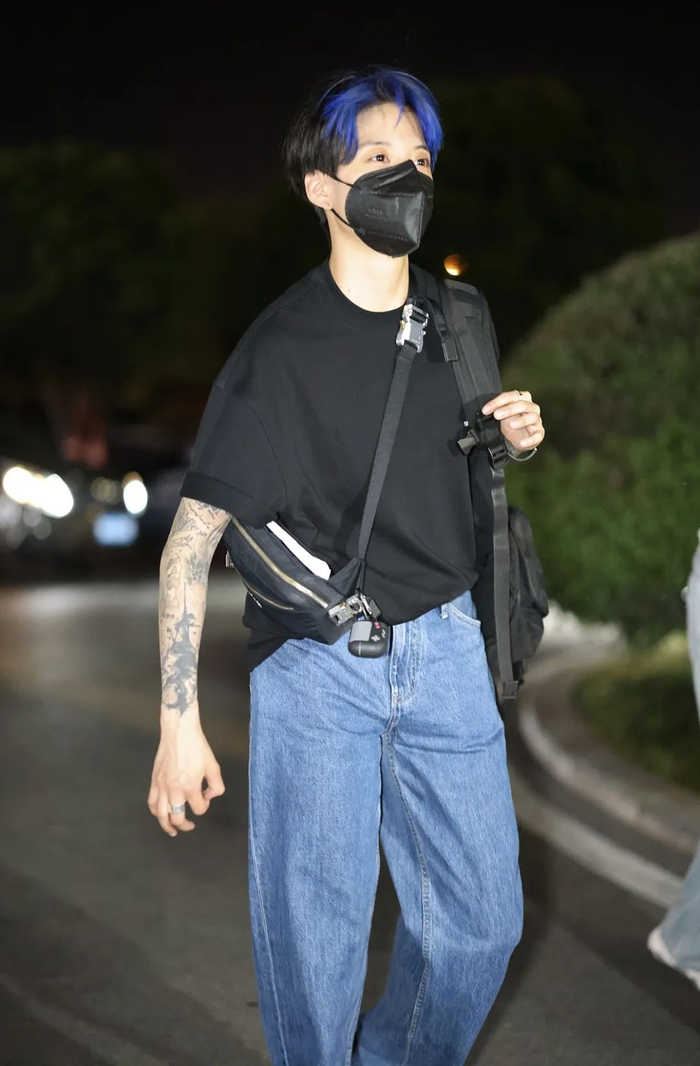 花臂Amber!且看且珍惜~简单的黑T和牛仔裤,用挎包做点缀,刘逸云你有点帅哦!