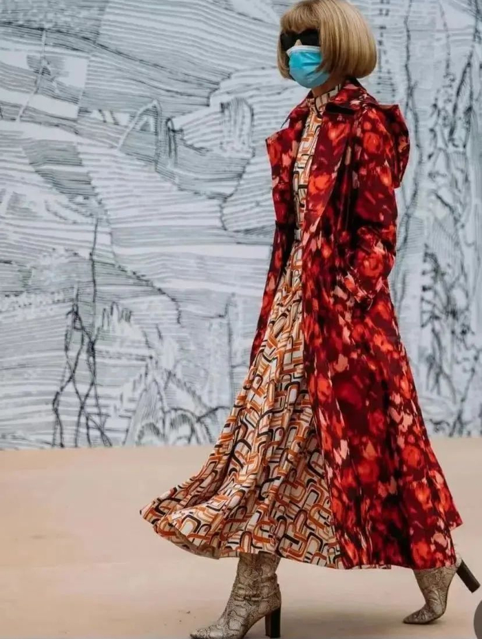 这双蛇纹靴看来是焊在女魔头脚上了!一如既往浮夸的印花裙子+风衣,是她的风格没错~。
