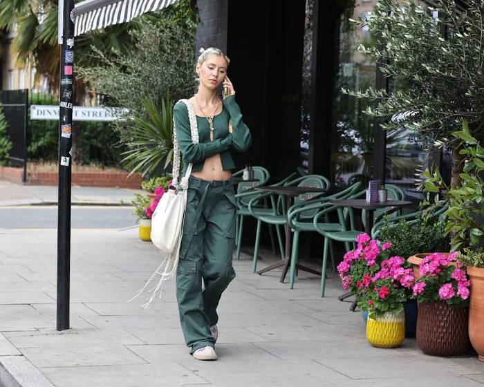 没想到工装裤和露腰针织衫也能玩“整身同色”,挎着大大的白色流苏包,松弛感强得嘞。