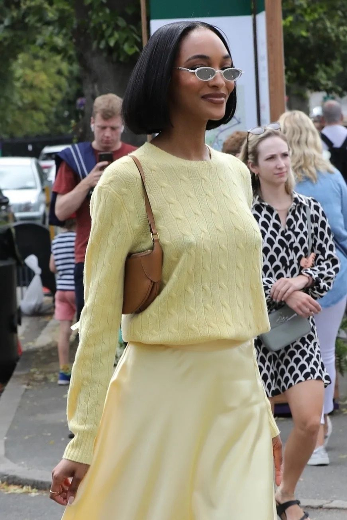 搭配了同样淡黄色的缎面半身裙和白色高跟,配色像朵小雏菊,整个温柔、俏皮又嗲嗲的小名媛一枚。