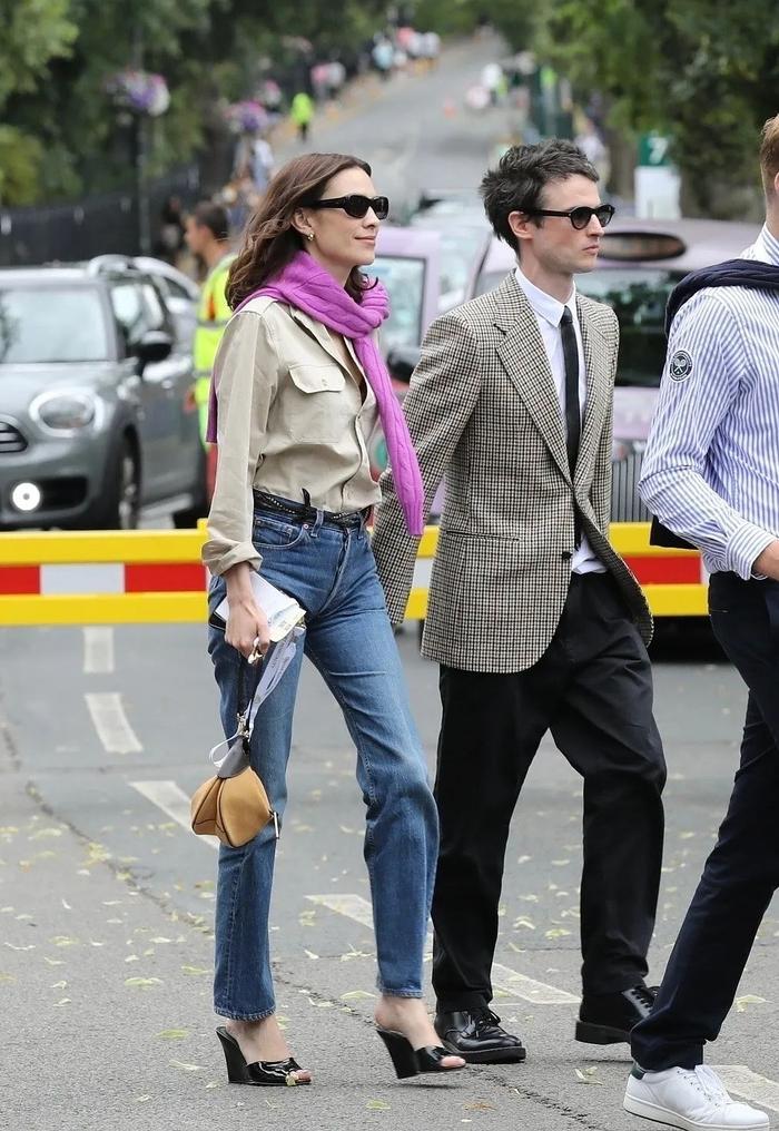Joel 和Christine也来看温网,白衬衣&西裤搭配卡其色外套和麂皮皮鞋,同色系框架眼镜一戴,蛮chill 的old money。