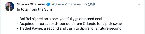 与此同时,太阳用一个26年首轮互换权从魔术交易得到3个次轮。过去2周,太阳通过交易得到了6个次轮签以及4个首轮签。