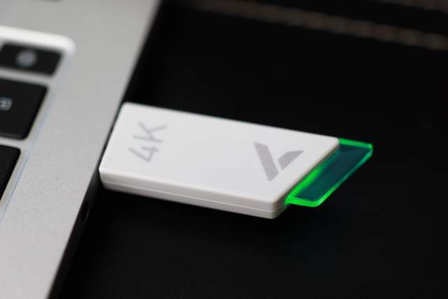 其实吸引我的还是这款鼠标支持雷柏V2M接收器(4K型)。它采用的是雷柏4K无线技术智能算法+NXP高性能硬件芯片,支持固件升级。对码后驱动支持4KHz/2KHz/1KHz回报率,对应0.25ms/0.5ms/1ms响应速度,所以可以根据自己喜好选择回报率了。这个4K接收器就是这个像U盘一样的东西,还有光源可以限制鼠标的电量状态,看起来很有科技感。