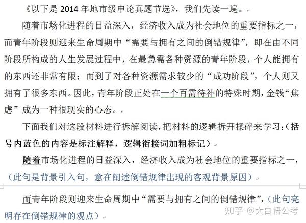 有心提高的同学可以去找到2012年对应的这道题目,自己作答练习一下。除了第一句话中的“相互矛盾”一词是我自己写的外,其他的关键信息点都来自于材料,这就是根据材料来作答申论。我们具体分析下这个答案的逻辑组成,体会一下申论综合分析的“分析逻辑美”。