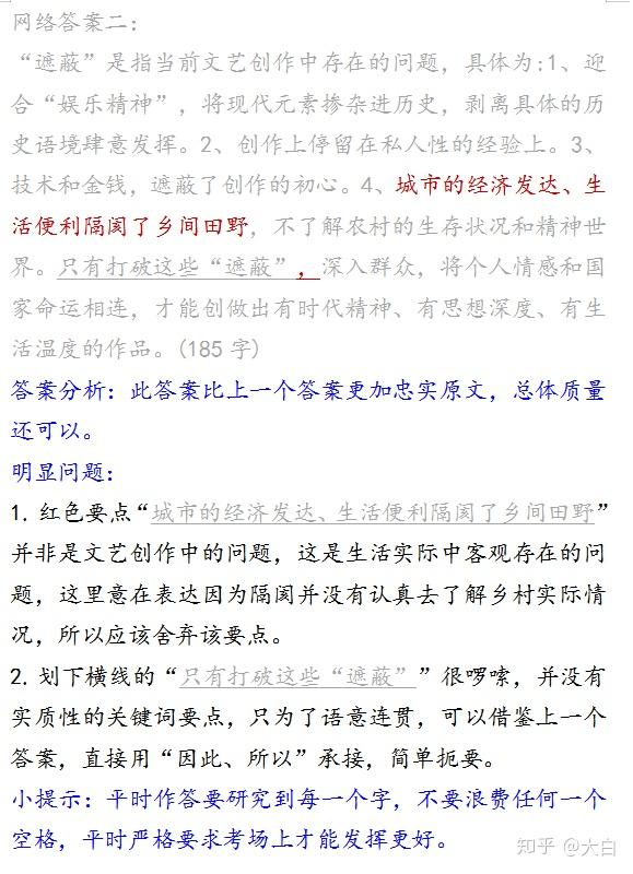 3.综合分析:以归纳概括为基础,只不过把各种散落在材料中的问题(表现)、原因、危害、意义、对策等要素(提取这些要素就是归纳的过程),用严谨的逻辑思维把要点提取出来排布好(排布要素的过程就是逻辑分析)。这就是综合分析题目的本质所在。启示题不必多说,解词解语题观点题,是典型的归纳概括外加逻辑梳理。