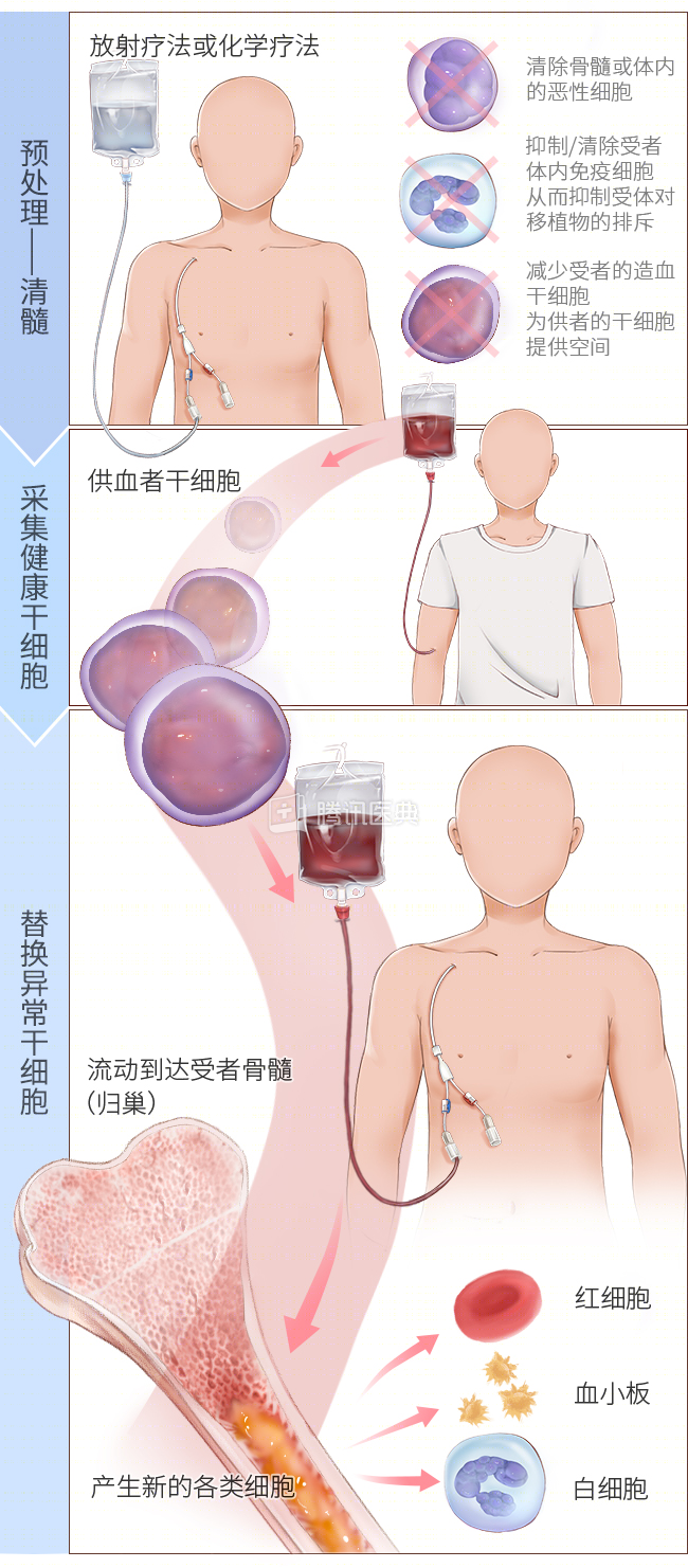 科普一下,移植的造血干细胞可以来源于:①配型部分相合的亲缘供者,如同胞兄弟姐妹;②半相合供者,即患者的父母或子女;③脐血、中国造血干细胞捐献者资料库(简称中华骨髓库)中的非亲缘供者,又称无关供者。患者及供者需要进行严格的人类白细胞抗原(HLA)配型鉴定,即使血型不合但如果HLA配型相合,即可作为供者。