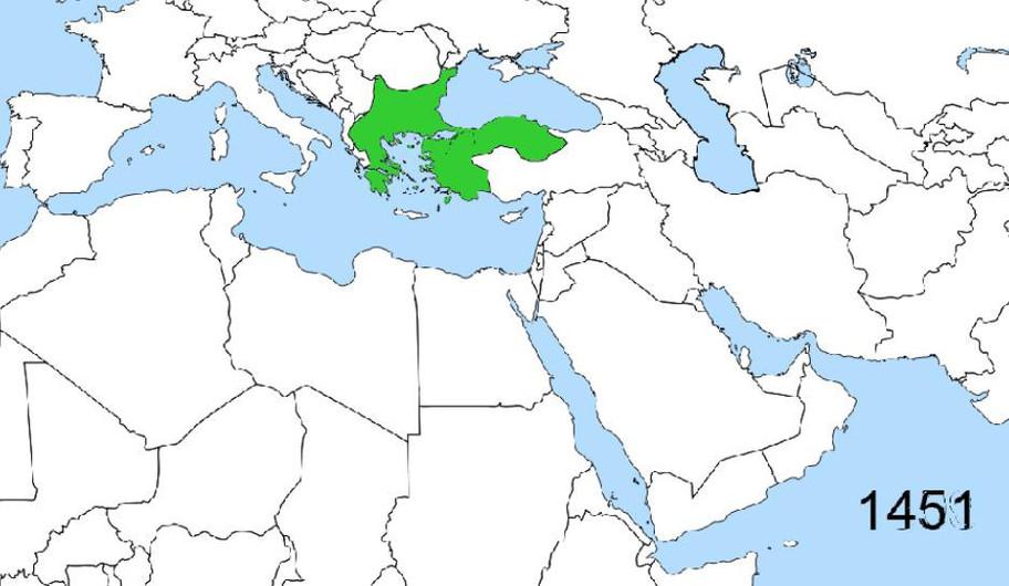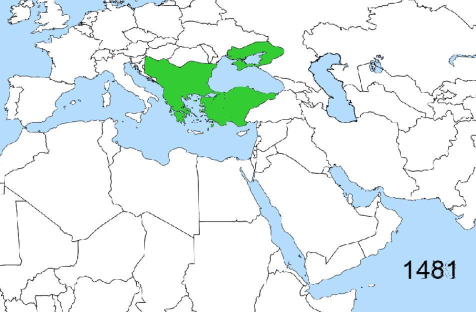 现在史料中1451-1481年的奥斯曼。如果是郑和船队的资料,《坤舆万国全图》应该有标注,最有可能就是这个规模这个位置的,横跨欧亚的“初级”奥斯曼,可是事实没有;