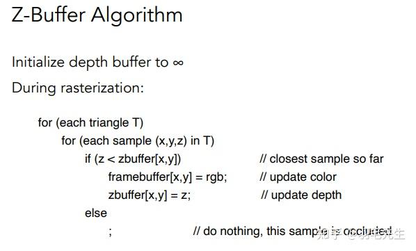 初始定义深度值为无穷大(距离相机无限远)。在对每个物体的每一个像素A进行光栅化时 ,判断A的深度值(DepthA)与同一位置P(DepthP)处存储的深度值的大小关系: 如果比”当前已绘制像素记录的深度值“小,则绘制像素,同时更新深度值,并用DepthA更新当前DepthP的值如果比”当前已绘制像素记录的深度值“大,则不绘制像素,也不操作深度值DepthP