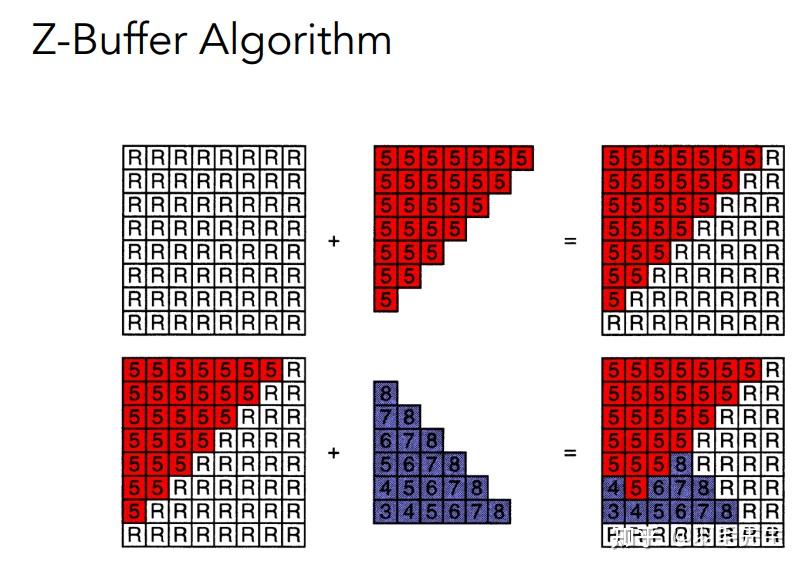 首先定义屏幕上所有像素的深度为无穷大渲染红色像素,由于初始为无穷大,所有红色像素都需要渲染。渲染蓝色像素时,需要判断深度大小关系来决定是否渲染。算法没有进行排序,只是记录当前所绘制像素的最小值,因此算法复杂度为O(n)对绘制顺序无要求。说明: 无法处理透明物体,需要特殊处理。