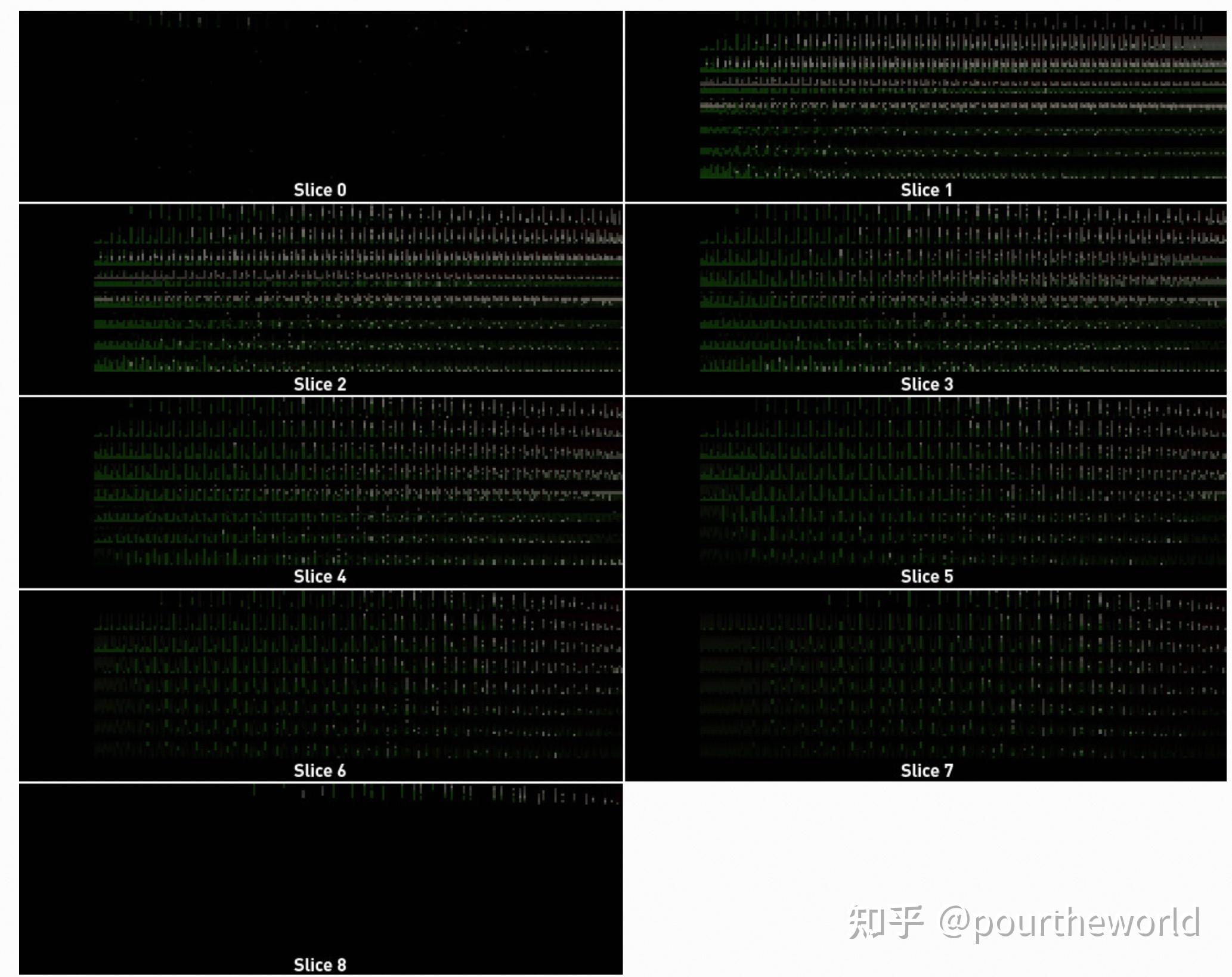 The Probe Ray Data texture array (all slices) from the Cornell Box scene而纹理数组每个 slices 的 row 对应了探针平面的探针索引,column 则对应了该探针索引对应探针发出的其中一条光线索引,每个 texel 最终保存了第 row 个探针发射出 第 column 条光线后,相交于某个最近平面的 distance 以及收集到的 incoming radiance: