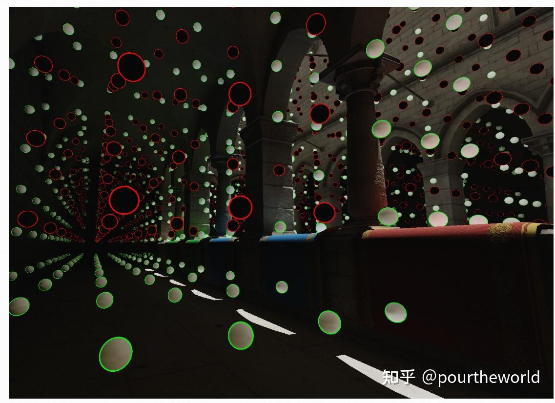 接下来 DDGI 继续进行 visibility-test (可见前文Radial Gaussian Depth) 。