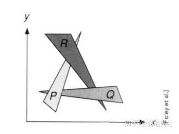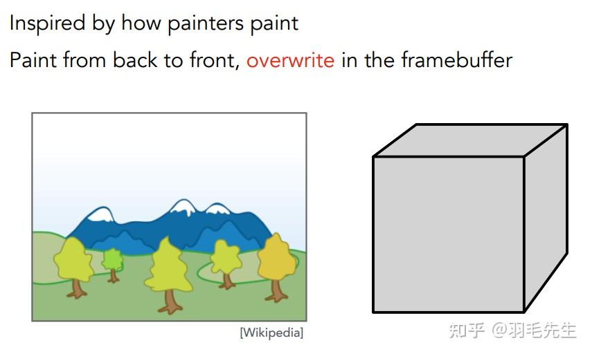 类比油画,先画远处的物品,再画近处的物品,覆盖之前画的内容。计算机实现:定义内容的深度,按照深度进行排序(复杂度nlogn),按照排序后顺序从远到近进行绘制。存在问题: 定义深度不容易排序有一定算力消耗无法解决循环遮挡问题。无法定义深度关系和排序。