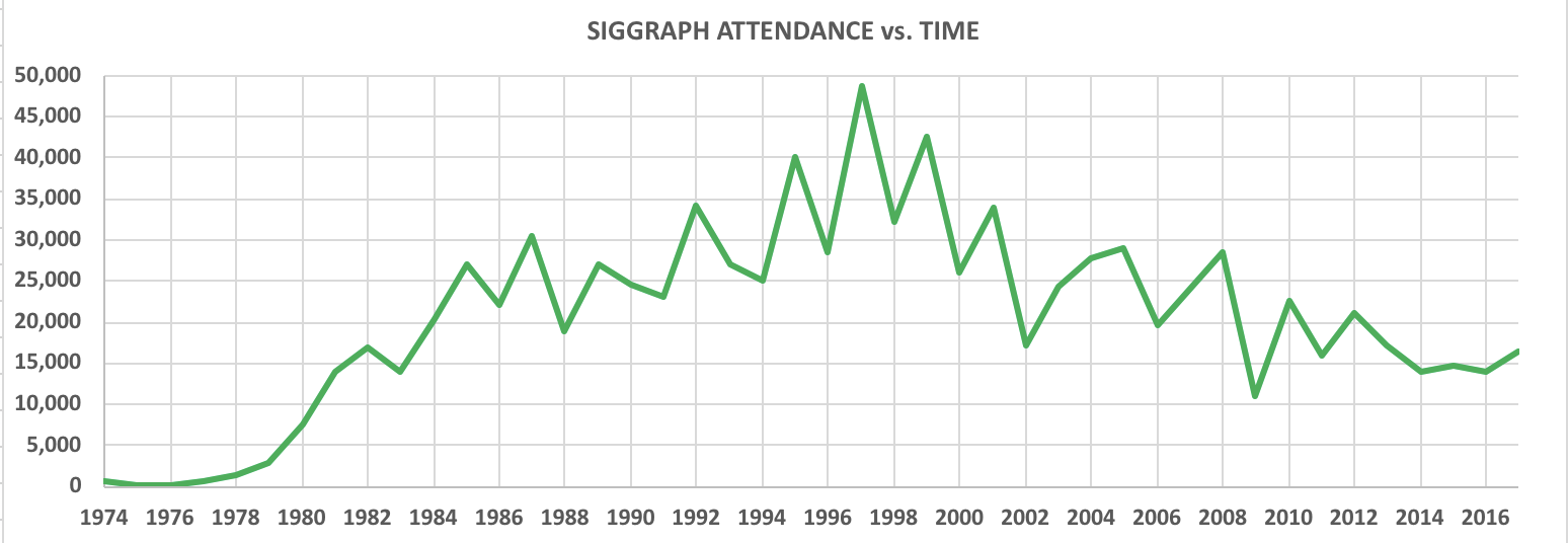 There is only one heroism in the world: to see the world as it is, and to love it.— Romain Rolland, The Life of Michaelangelo (Preface)二十年前,图形学研究如火如荼,现在回归正常了,在某些人眼里就变成已死了。计算机理论顶会STOC、FOCS一年才三百多人,没人觉得是已死学科;网络顶会SIGCOMM一年也三百多人,没人觉得是已死学科;19年CVPR和NeurIPS暴涨也不过分别九千和一万五千人。SIGGRAPH这几年,虽然人数确实比十年前有所下降,但是参会人数都在15000-20000左右,19年是18000左右。放到整个CS学科里,算是最大的会议了。一个已死的学科会有这么多人感兴趣?
