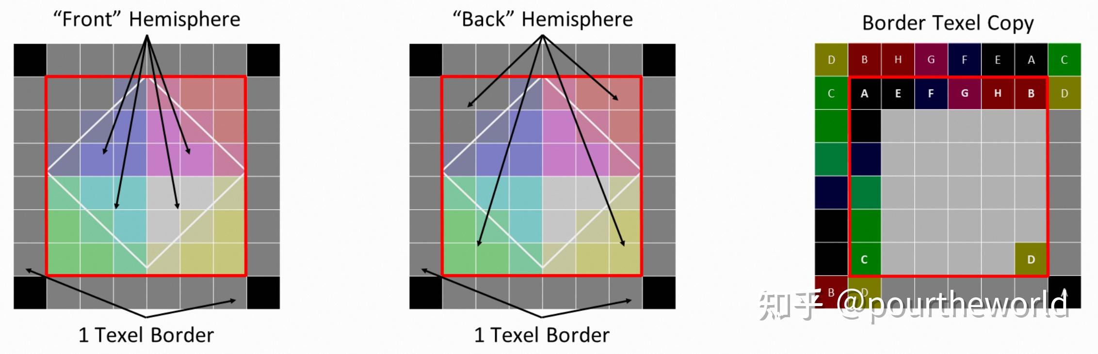Octahedral parameterization of a sphere在本专栏 Octahedron Projection 提到过 Octahedral map 经过二次投影后将上半球和下半球分别保存到了纹理的中心部分和边缘部分。此外,为了支持边缘部分的 bilinear sampling,额外添加了 1-texel 的边界: