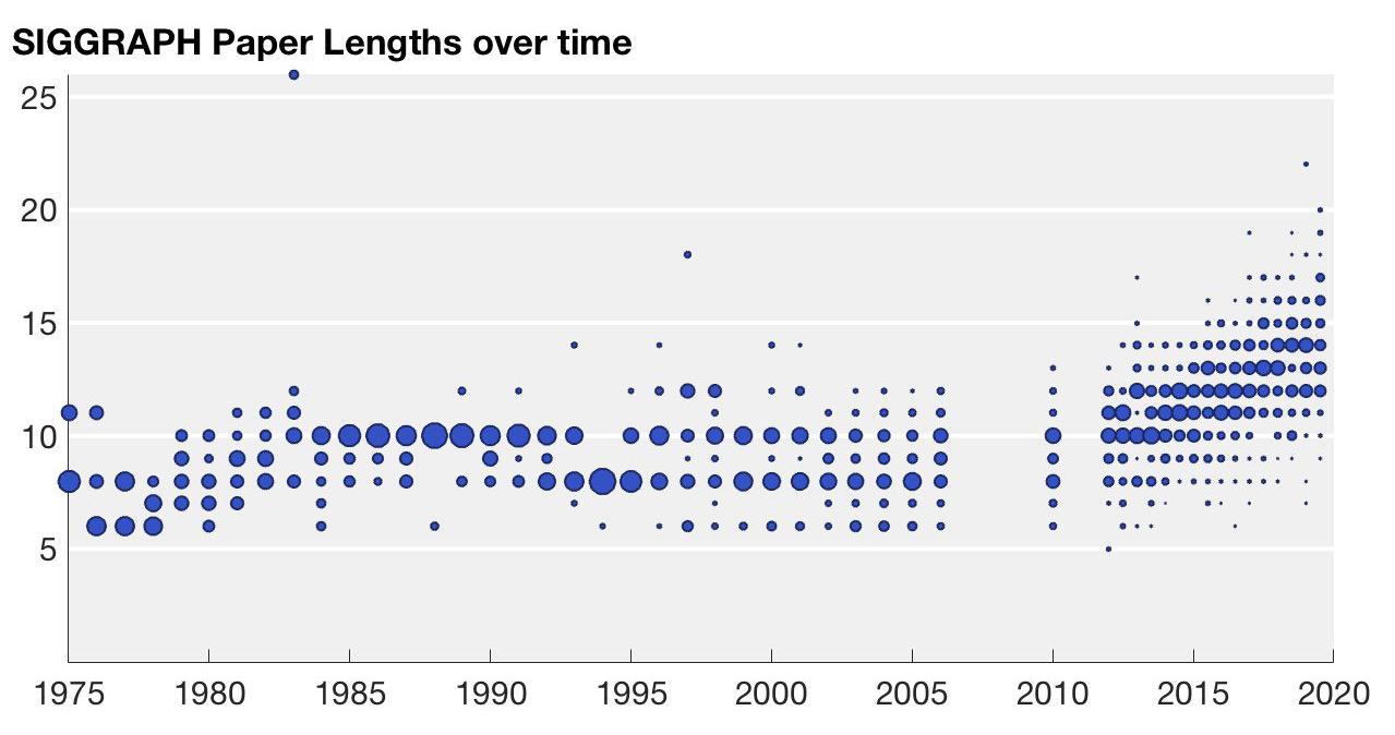 SIGGRAPH论文长度随年份的分布(Alec Jacobson)。人们对效果和性能要求越来越高,研究变得越来越难和复杂,这其中一个迹象便是,SIGGRAPH文章长度在最近几年一直在增加。而对于非关键需求,每年的研究成果又是供大于求的:比如想做一个小众的图形效果,要求不太高的话,可能有四五种技术路径、十几篇各有优劣的研究工作供开发选择。