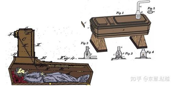 在民间更有许许多多濒死体验的故事流传下来。甚至还有因为濒死体验的可能性而申请的专利。1896年,一个发明轰动了全欧洲,一个俄国贵族发明了一个“防活埋装置”:倘若有人下葬后突然苏醒,只要肢体发生移动,那么机关就会被触发,地面之上的铁盒盖弹开,为棺材中的人提供充足空气;与此同时,地面上的铃铛也会铃声大作。当然了,棺材里的人也可以通过呼吸装置大呼求救,可谓是三保险,这都是因为曾经发生过濒死体验而担心自己亲人被“活埋”。