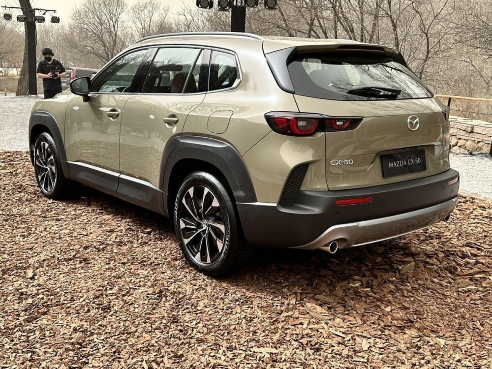 马自达CX-50的车尾保持了饱满简约的设计,尾窗上沿配有一块凸出的扰流板,中间还配有横条的刹车灯带,尾灯拥有较为锐利的内尖角,灯腔内则采用了勺型的灯带设计,整体轮廓与头灯形成呼应。略微熏黑的处理也让尾灯点亮后更有运动气质。内凹式的号牌区域两侧配有竖状的导流槽,与车头的设计相同,车底也覆盖了大面积的黑色组件,同时两侧配有真实的双边单出排气设定,增强了整体的运动属性。
