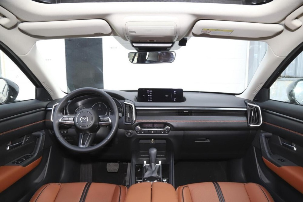 走进马自达CX-50行也的车内,整体内饰风格保持了极简化风格,中控台面通过贯穿式的饰条隔断处理实现了台面的一分为二,横向的出风口也隐藏在隔断之中,而竖状的出风口则分列台面中部和两侧,用料方面,台面顶部采用了大面积的软性面料进行覆盖,细节处也配有缝线处理,金属饰条在细节处的加持也使得车内装饰更有质感。宽扁的横向中控屏位于台面中央,下方配有简单的旋钮和按键搭配,平时使用起来也较为便利。