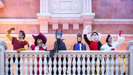 4 、反派角色演出 :下午五点在城堡阳台准时出现,包括黑巫婆、红心皇后,哈迪斯等反派人物每晚亮相巡游主干道,这里无疑是各位反派们最适合拍照的地方,身穿反派服饰和迎宾阁的迪士尼公主或王子合影也是别样的体验!