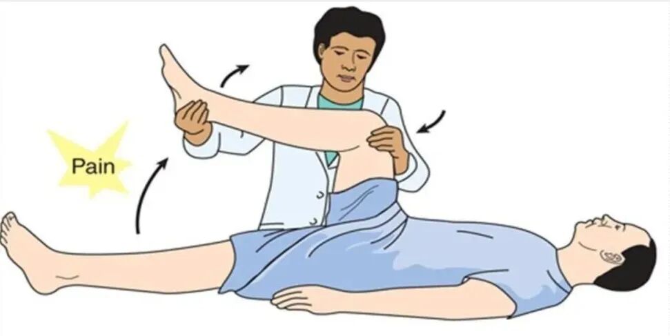 解析:患者采用去枕仰卧位,一侧髋关节和膝关节成90角弯曲,检查者将患者小腿上抬伸直,正常应该能够达到135°,如果遇到阻力或疼痛,则