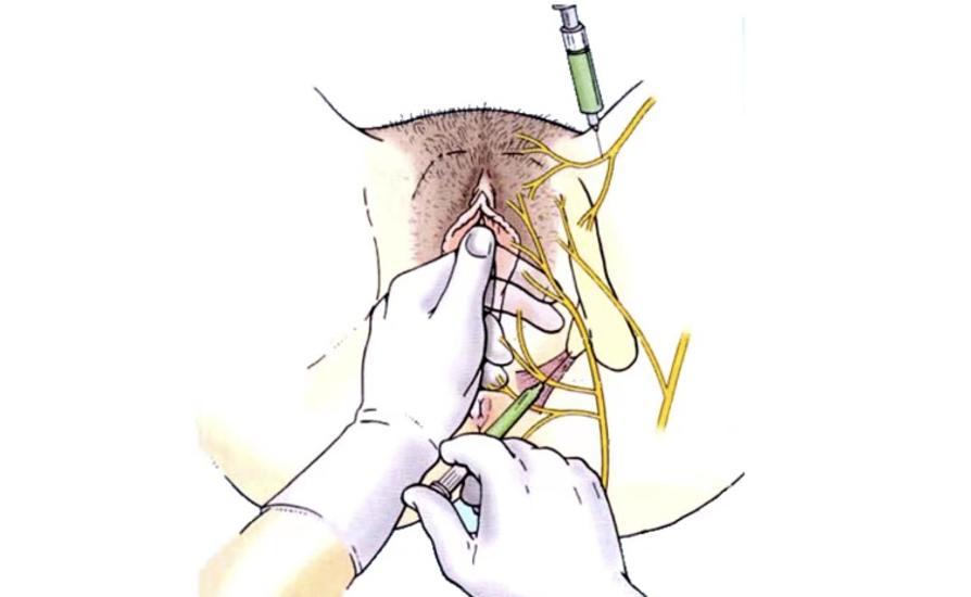 中指、食指伸入阴道,触及坐骨棘及骶棘韧带,将针在坐骨结节和肛门之间中点穿刺进入,穿过骶棘韧带有落空感,回抽无血,则可注入局麻药;适用于自然分娩、会阴切开缝合术等,可达到止痛的效果。