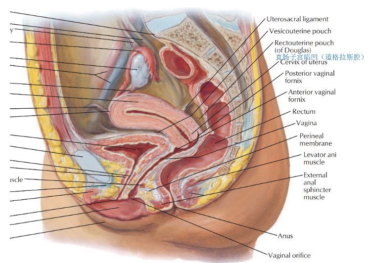 女性直肠前面紧邻直肠子宫陷凹,临床上常称为“道格拉斯腔”,是女性直立时腹膜腔的最低部,易有积液;女性经肛门指诊可触及子宫颈、阴道上部。