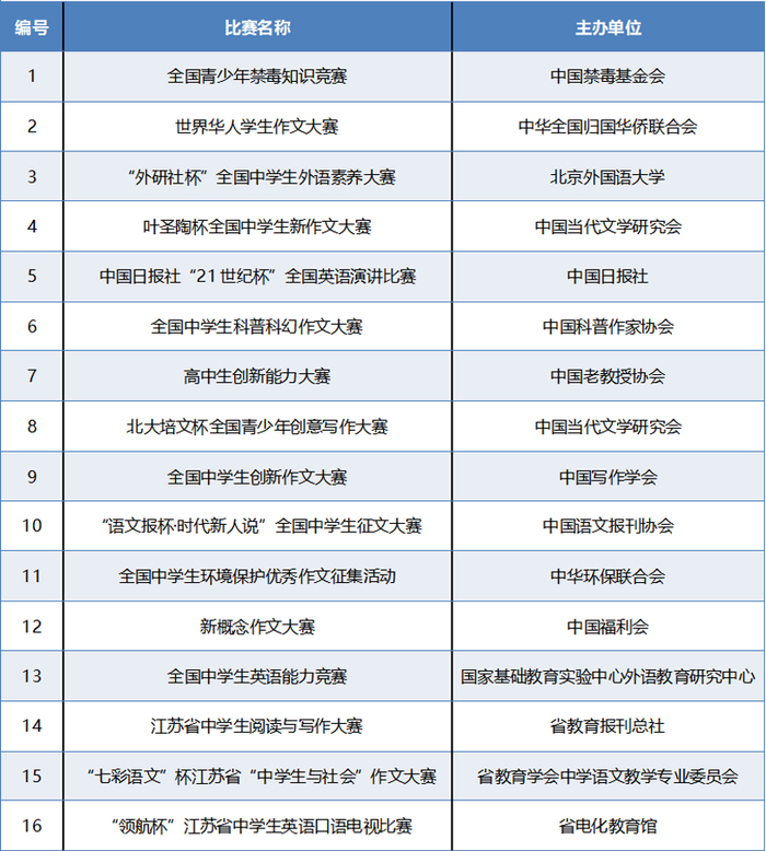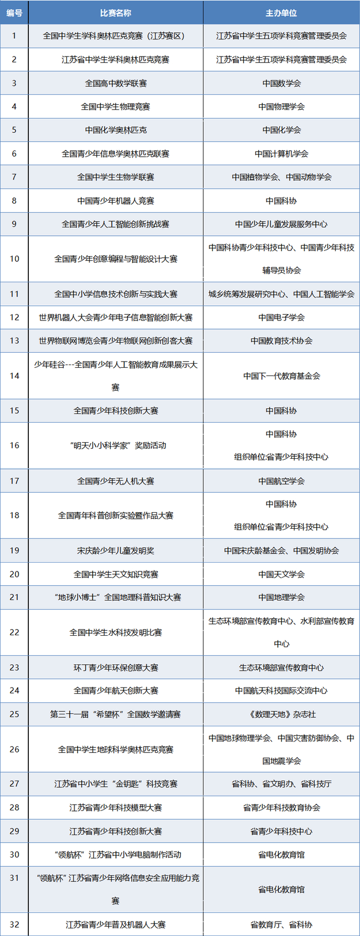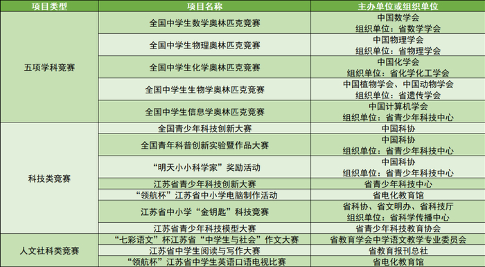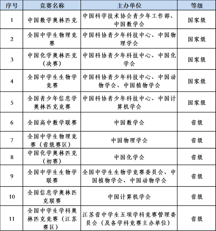 (一)高中阶段参加全国中学生数学、物理、化学、生物学、信息学奥林匹克学科竞赛,并获得省级赛区二等奖(含)以上(主办单位应为中国数学会、中国物理学会、中国化学会、中国植物学会和中国动物学会、中国计算机学会)。
