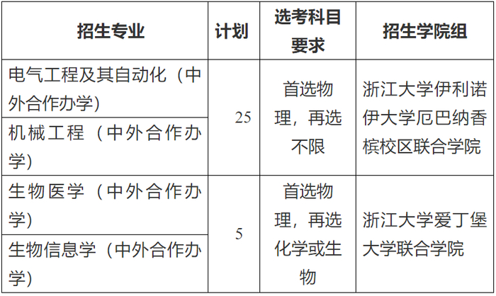 注1:浙江大学伊利诺伊大学厄巴纳香槟校区联合学院招生的2个专业共用25个招生计划,浙江大学爱丁堡大学联合学院招生的2个专业共用5个招生计划。