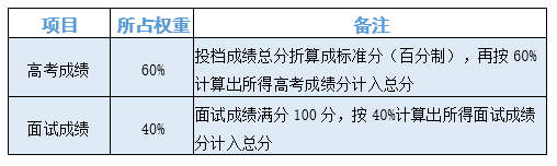 综合总分=考生高考投档成绩(按满分100分折算)×85%(四舍五入取2位小数)+学校综合面试成绩(满分100分)×15%(四舍五入取2位小数)。