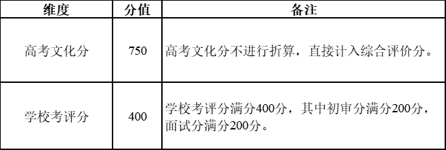 综合评价录取总成绩满分为750分。其中,高考成绩按考生高考分数的60%比例计算;入学测试成绩满分为225分,按入学测试的实际成绩计算;高中学业水平合格性考试成绩满分为75分,考生学业水平合格性考试成绩全部合格(或新高考改革前的往届学生学业水平5门必修科目全部合格,或C级及以上等级)计75分。