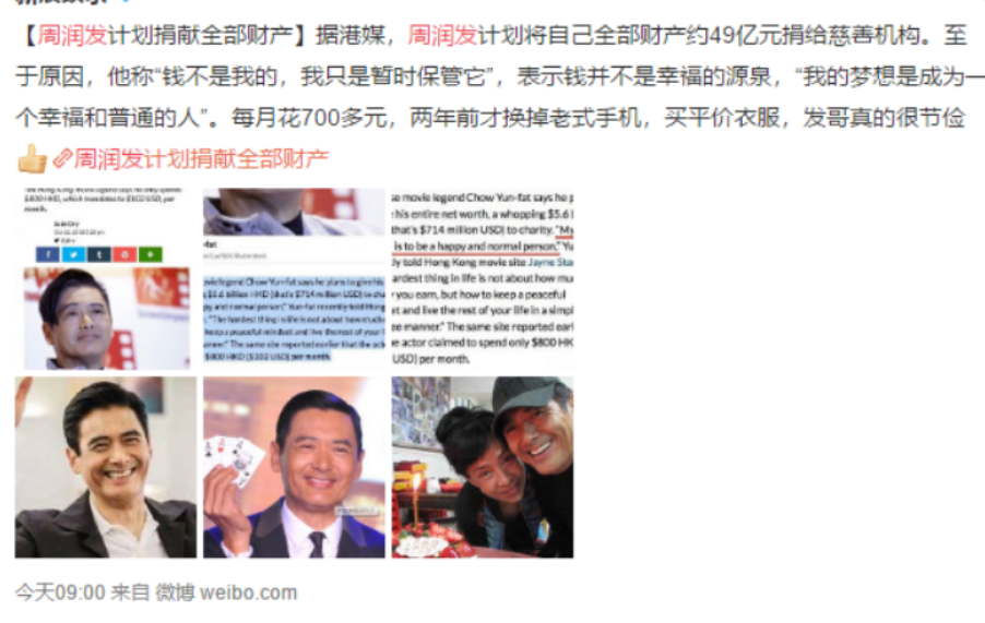 另一次是周润发接受《Jayne Stars》采访时说,计划将自己的全部财产56亿港元(约49亿人民币)捐给慈善机构 。