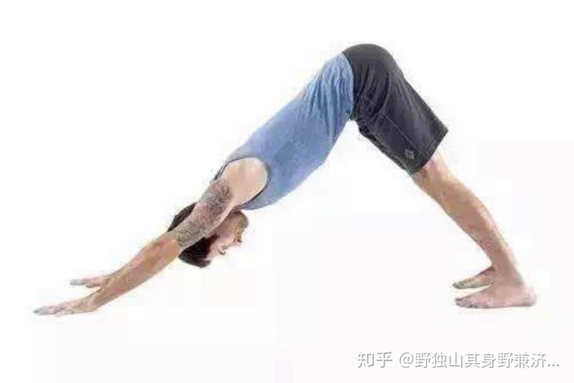 这个叫下犬式,一样的问题。首先我强调一下,既然有人认为瑜伽体位法创造出来就是为了做爱,那么一开始就是如此,所以不存在发展到一定时期,女性开始训练以后,这种让人无语的偏见才出现,是从这个东西一出现,那后面的偏见就同时被孕育出来了。但是,背景是,女人不能练,男人才能练,那只能让男人保持体位法来做爱。可是,这个下犬式,如果你固定髋关节和肩关节,你的活塞运动都做不到,你难道要女性在那个三角形下面做一个分腿手倒立,把阴道和阴茎结合,再做倒立俯卧撑来满足活塞运动吗?脑子是个好东西,希望那些人有。