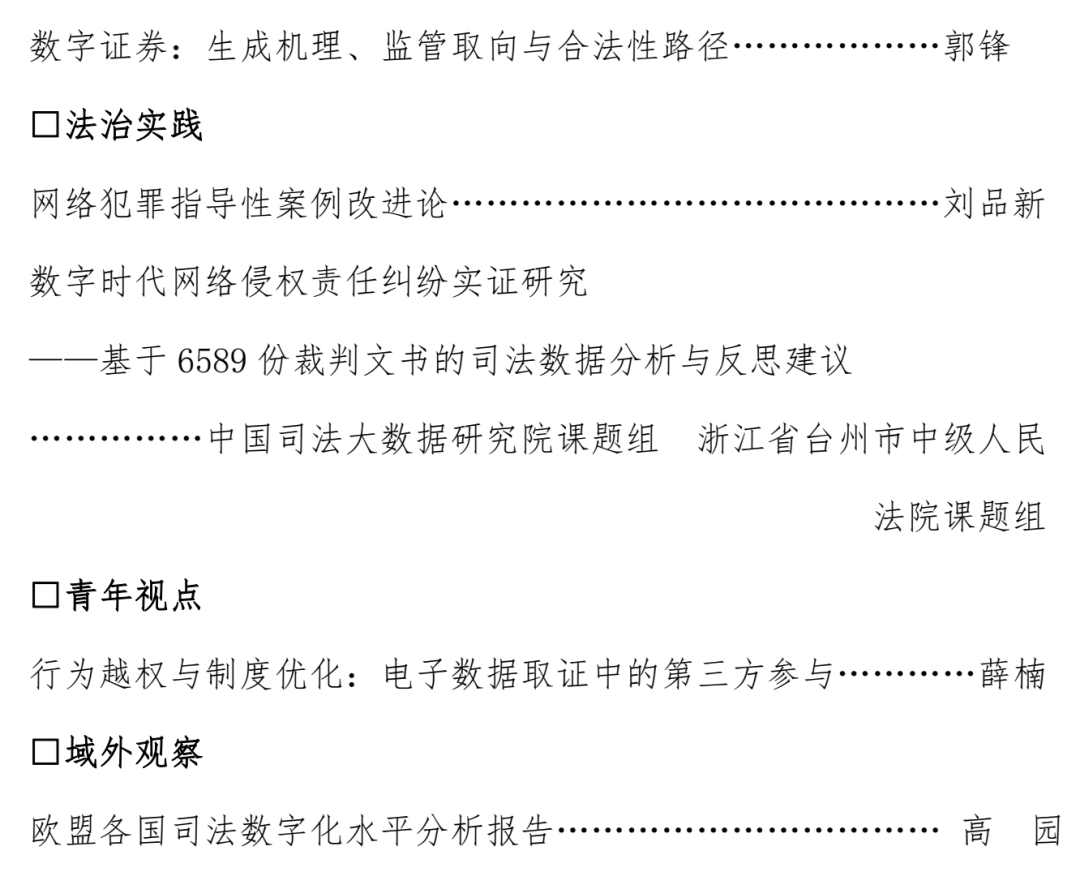 《数字法治》以解决我国数字时代法治建设的重大理论和实践焦点、难点问题为己任,恪守求新、务实、严谨的理念,弘扬兼容并蓄的学术传统,设有“圆桌话题”“学术专论”“法治实践”“青年视点”“域外观察”等栏目,旨在共同探讨如何有效应对数字时代新发展带来的新问题和新挑战,助力数字社会的法律法规体系建设,塑造数字社会的法治秩序,加快数字中国、法治中国建设的理论研究,更好地服务我国经济社会发展,增强我国在全球数字治理领域的话语权和影响力,为推进中国式现代化提供有力的学术理论支撑。