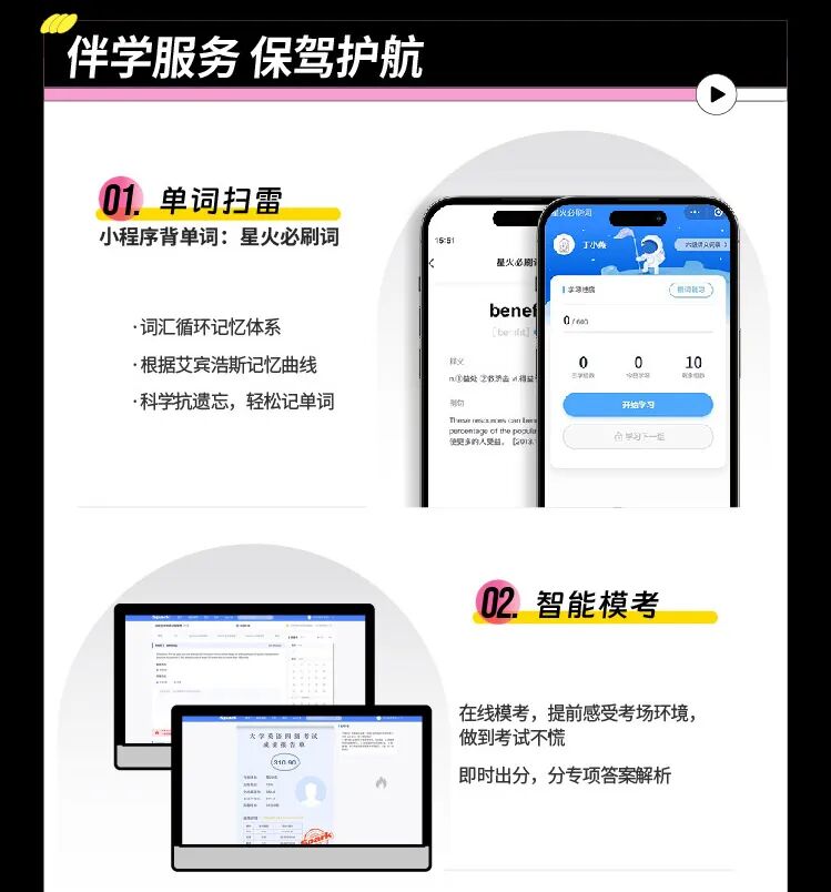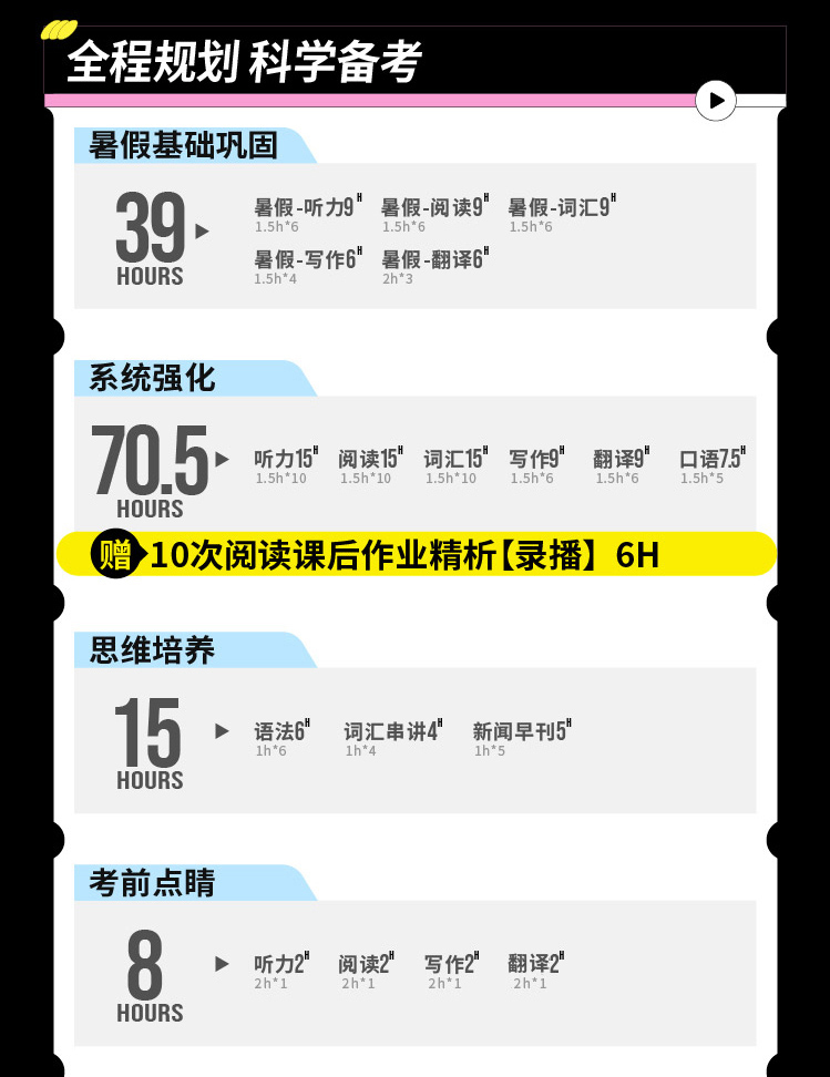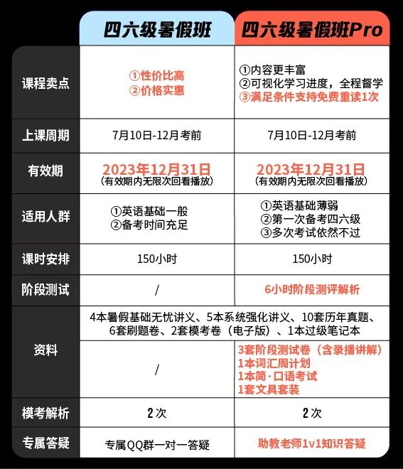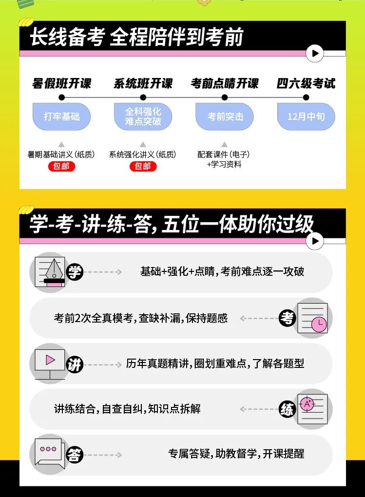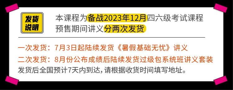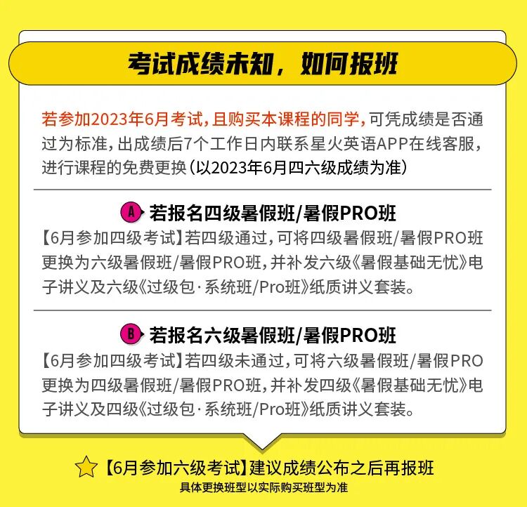 6月四六级考生 放心报名!出分后可享受「免费换课」●6月四级考生(报名四级暑假班)若四级通过,可将四级暑假班免费换成六级暑假班继续学习,并补发相应资料。●6月四级考生(报名六级暑假班)若四级未通过,可将六级暑假班免费换成四级暑假班继续学习,并补发相应资料。以上,无论怎么考,怎么报,都能从暑假学到23年12月四六级考前,均摊压力,稳步前进!