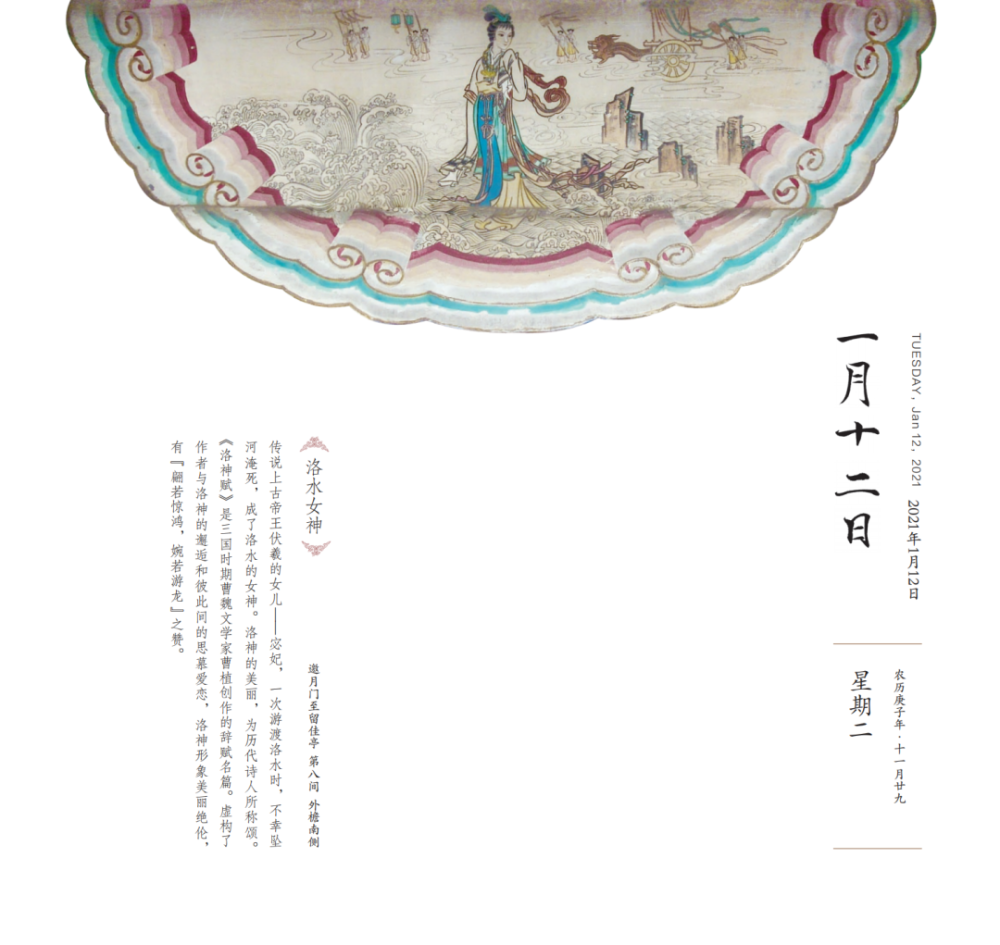 日历依照长廊东起邀月门、西止石丈亭的顺序进行排版,便于游客在长廊漫步、细品彩画的同时,可以按图索骥,方便快捷地找到彩画的位置,深入了解其中的文化故事。
