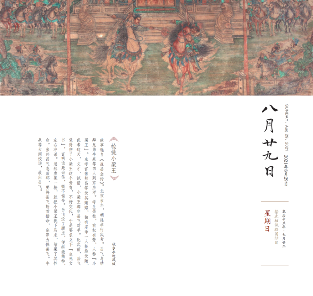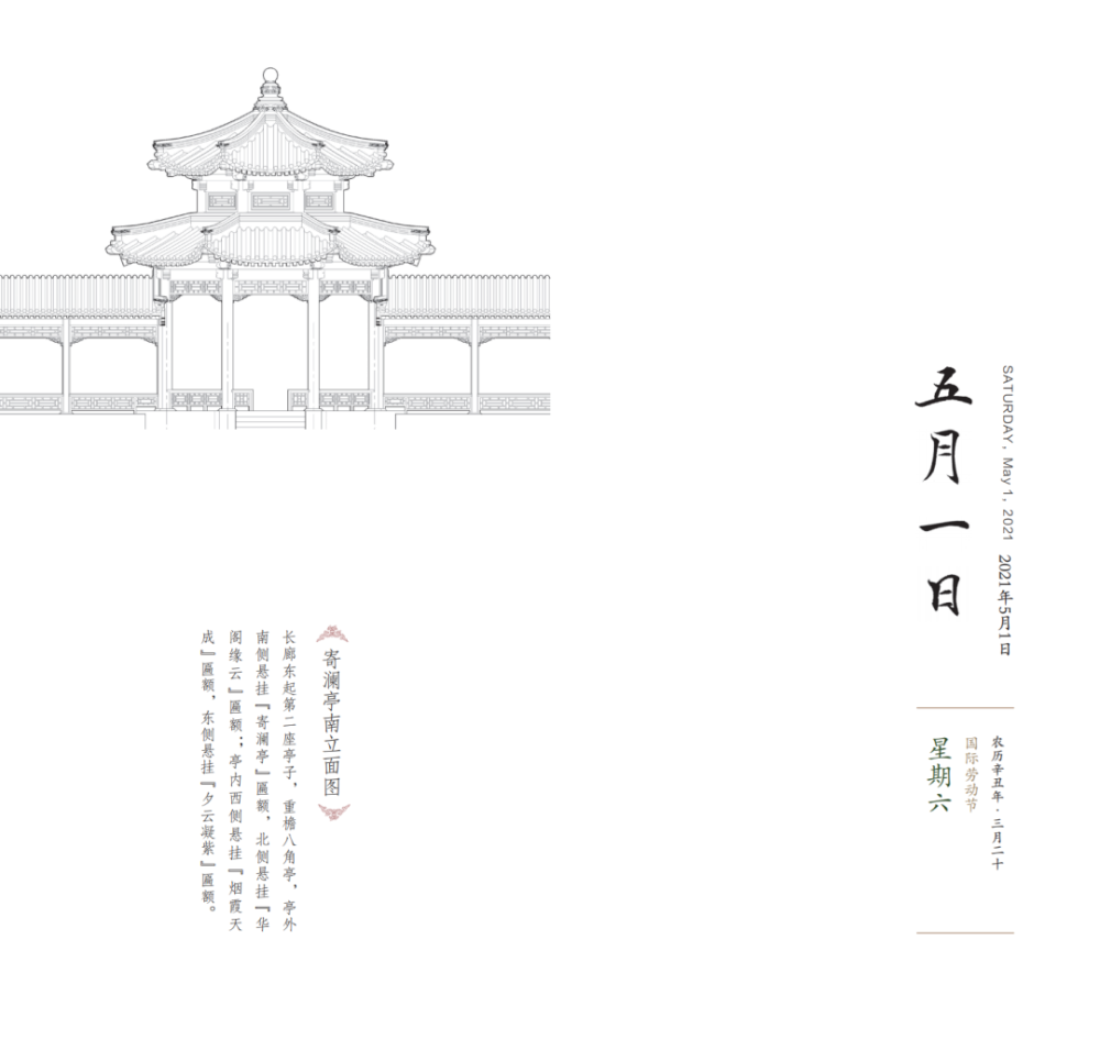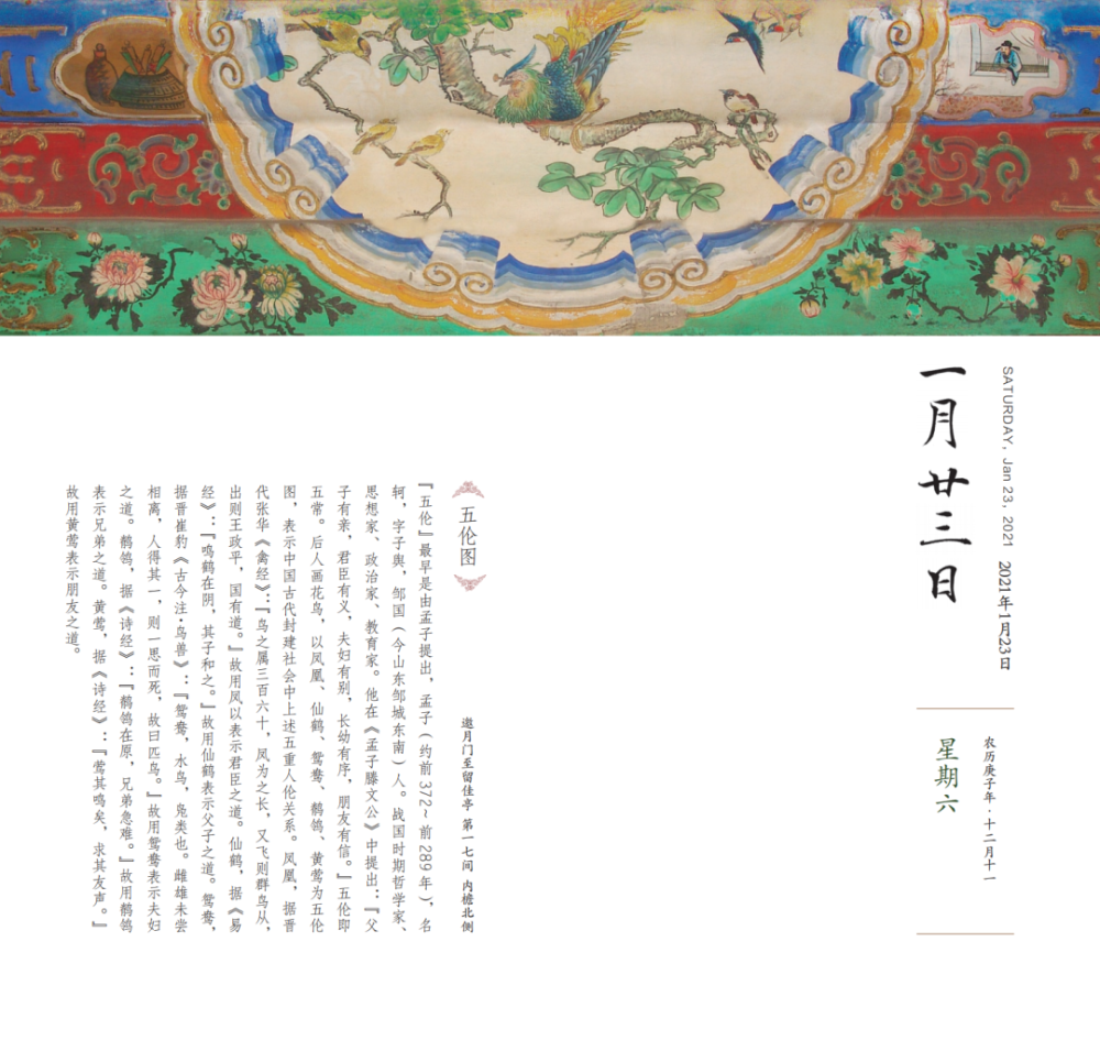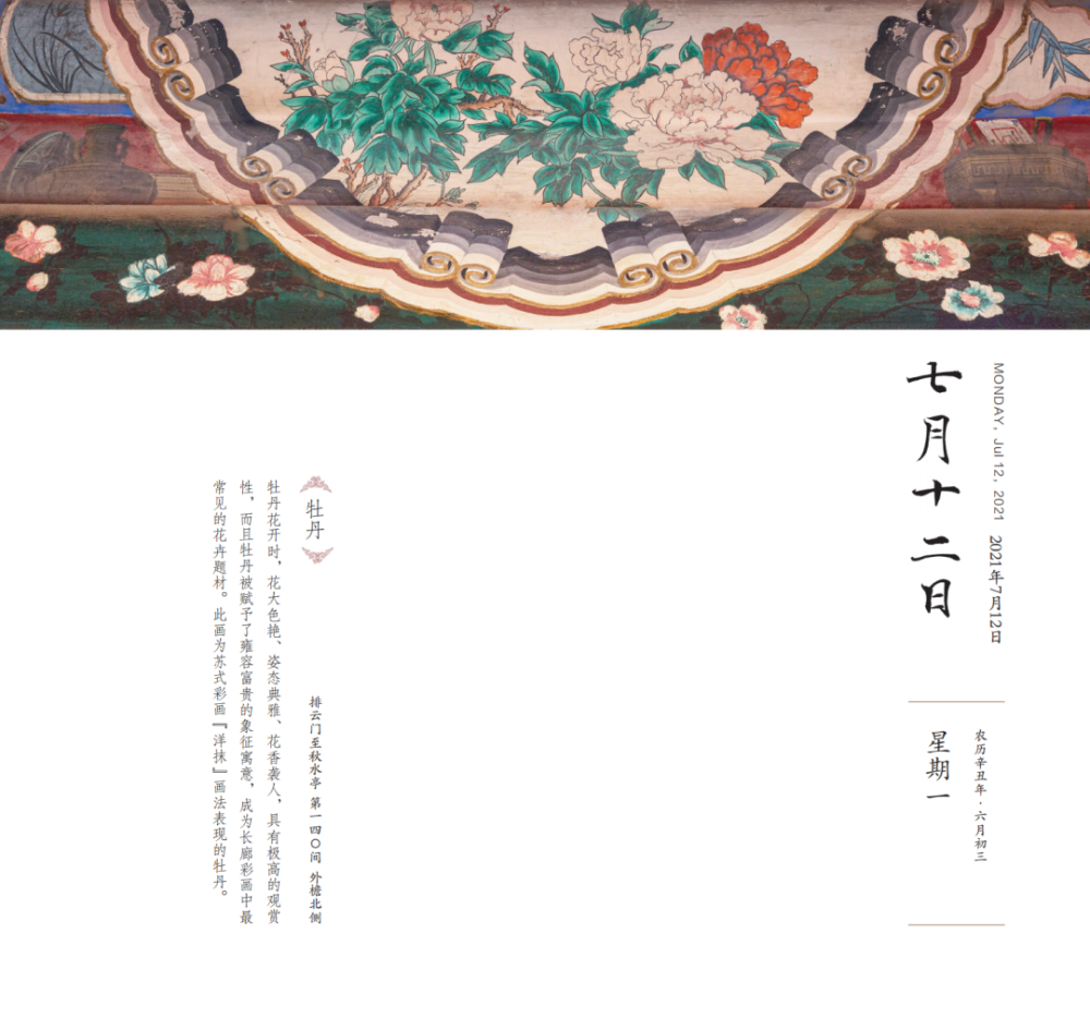 此次推出的《颐和园日历2021年(长廊彩画)》就是对长廊彩画这一艺术瑰宝进行的文化创作。日历中亮点突出、看点纷呈,有如下五大特点: