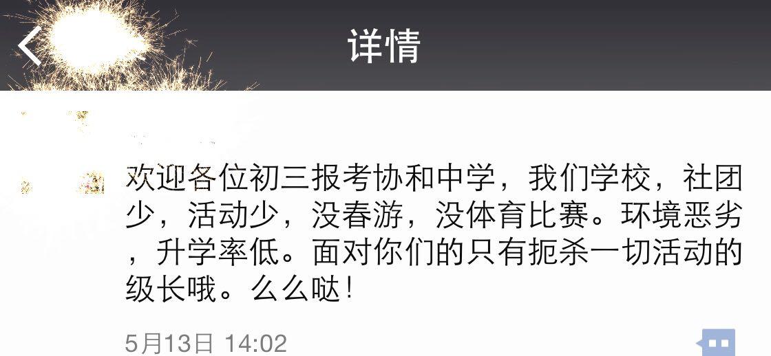 虽然讲的有点严重了(而且环境低劣升学率低绝对是为了凑字数才写上去的),但确实不假。除了校运会之外其他的体育比赛就没了,之前有学生自己组织过羽毛球赛,结果打到决赛不让打了,之后学生自己组织的篮球赛也是没有尾声了。虽然学校是以安全问题而禁止,但说真的其实还是挺让学生不满的。