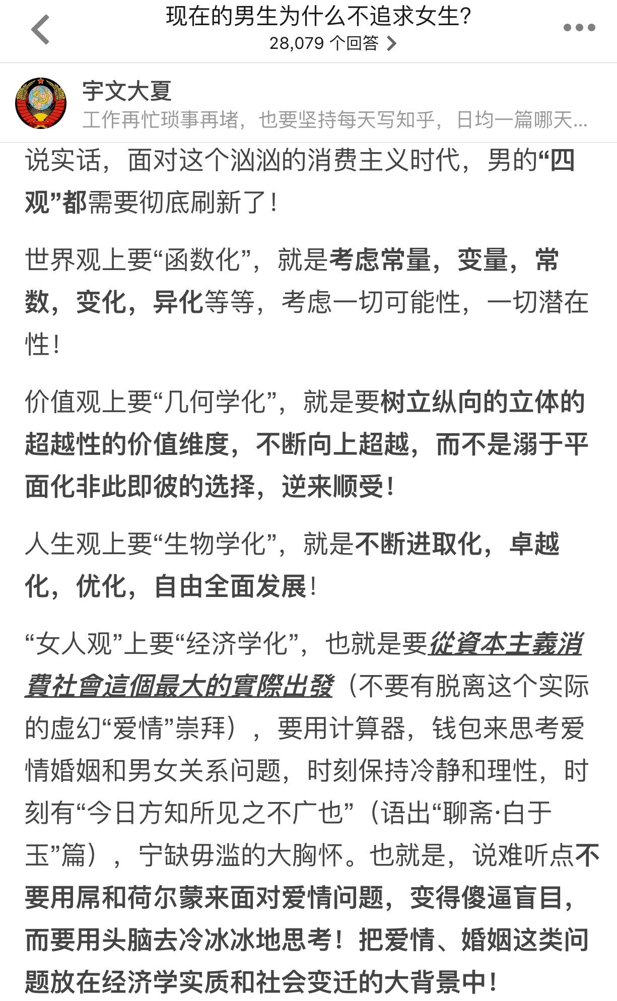 尤其是价值观明确了(知道任何事情价值有多大,值不值得,懂得凡事先权衡),所以不会因为“屌”事而把整个精神世界和人生搭进去,不会搞这种全盘付出毫无回报的买卖!你懂得了,有些渣女邪女,她们最多只有“一发”“一炮”的价值,没有辗转反侧寤寐思服的价值,更没有卿卿我我男欢女爱的价值,更没有比翼双飞白头偕老的价值!