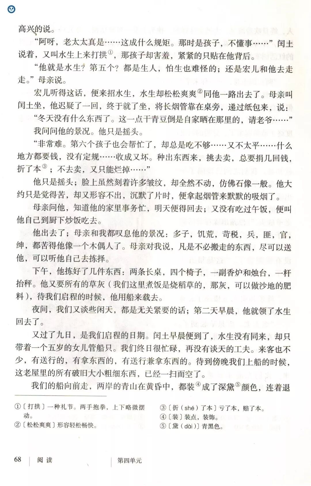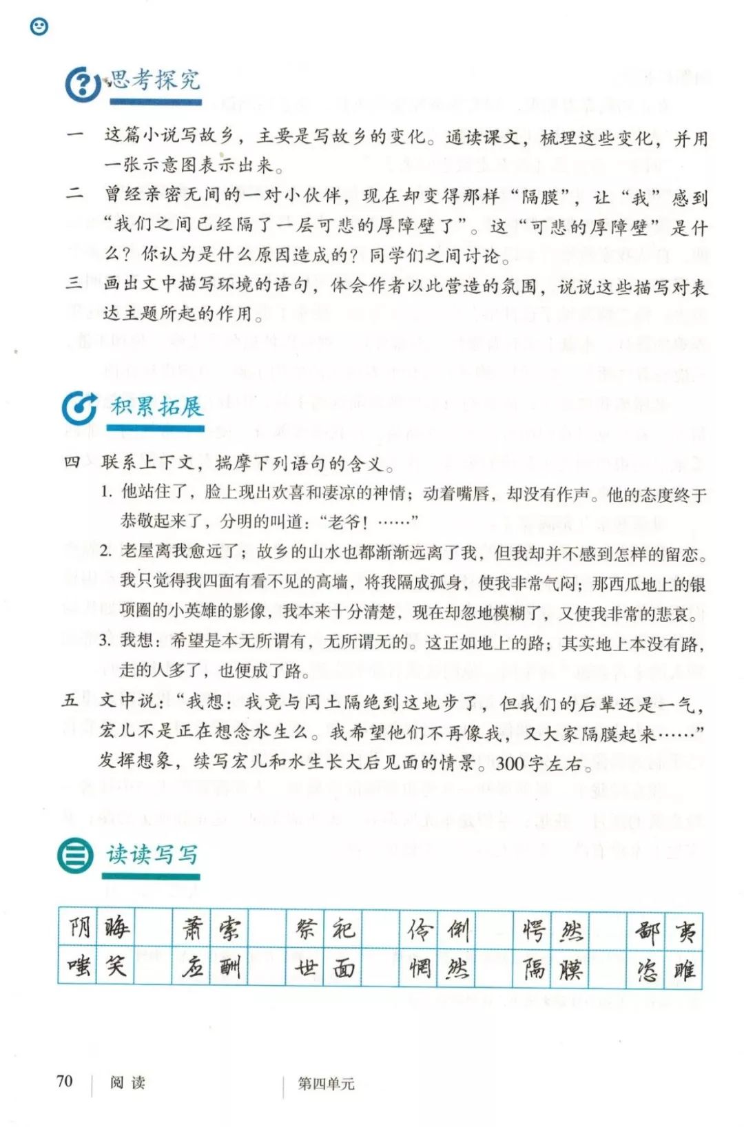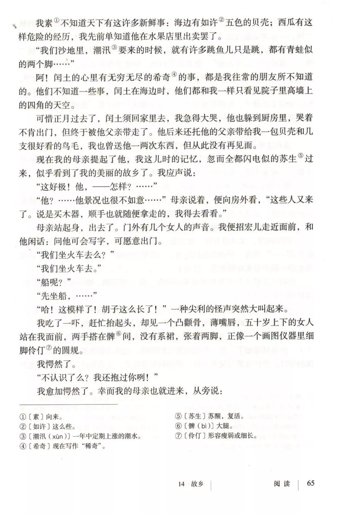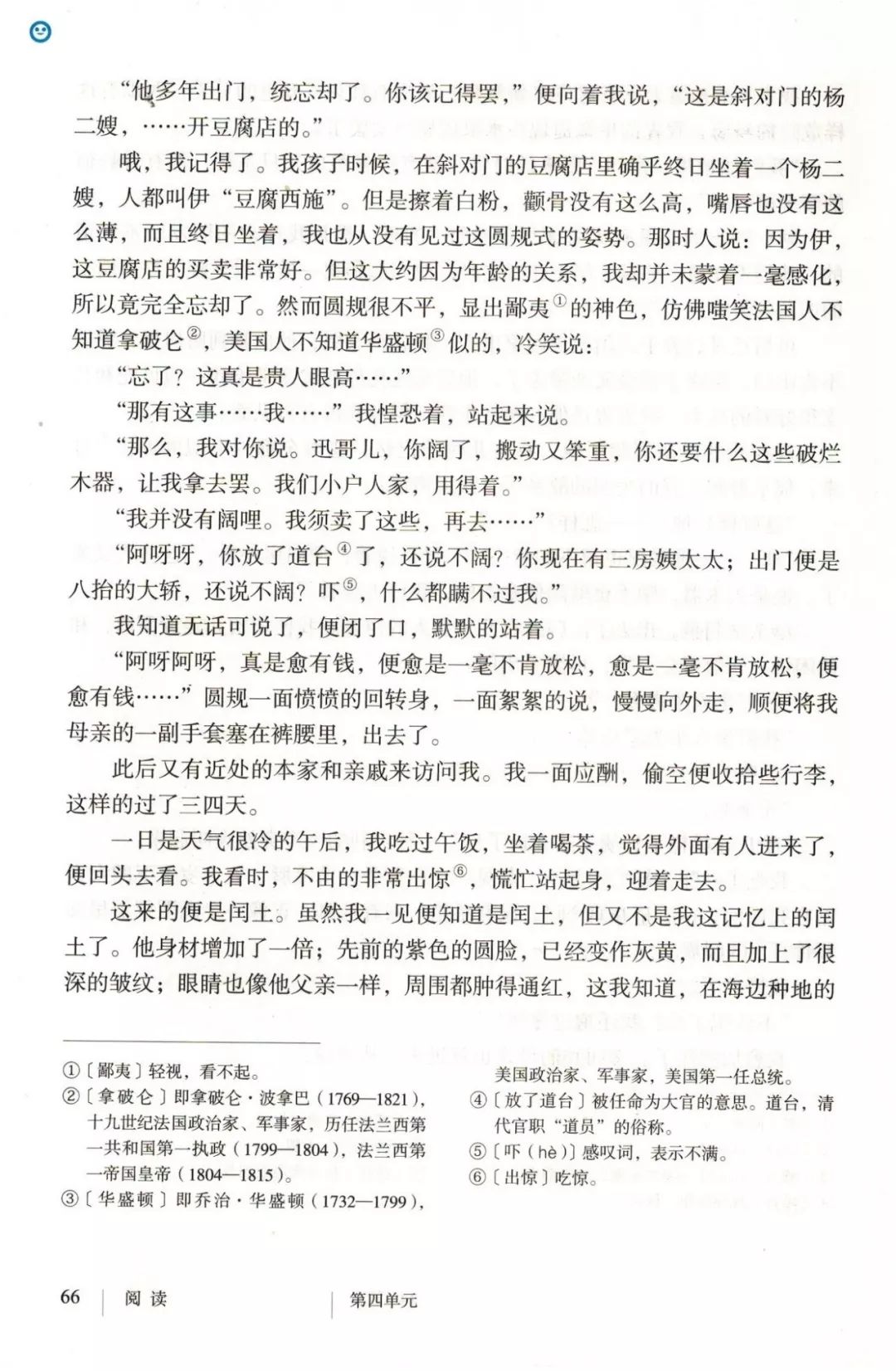 3.答案 不矛盾。闰土见到阔别多年的儿时好友,自然高兴,所以“欢喜”;但多年的世态炎凉,以及贫困、窘迫的生活使他感到痛苦、难堪,所以脸上又现出“凄凉”的神情,表现了闰土见到儿时朋友的复杂心情。
