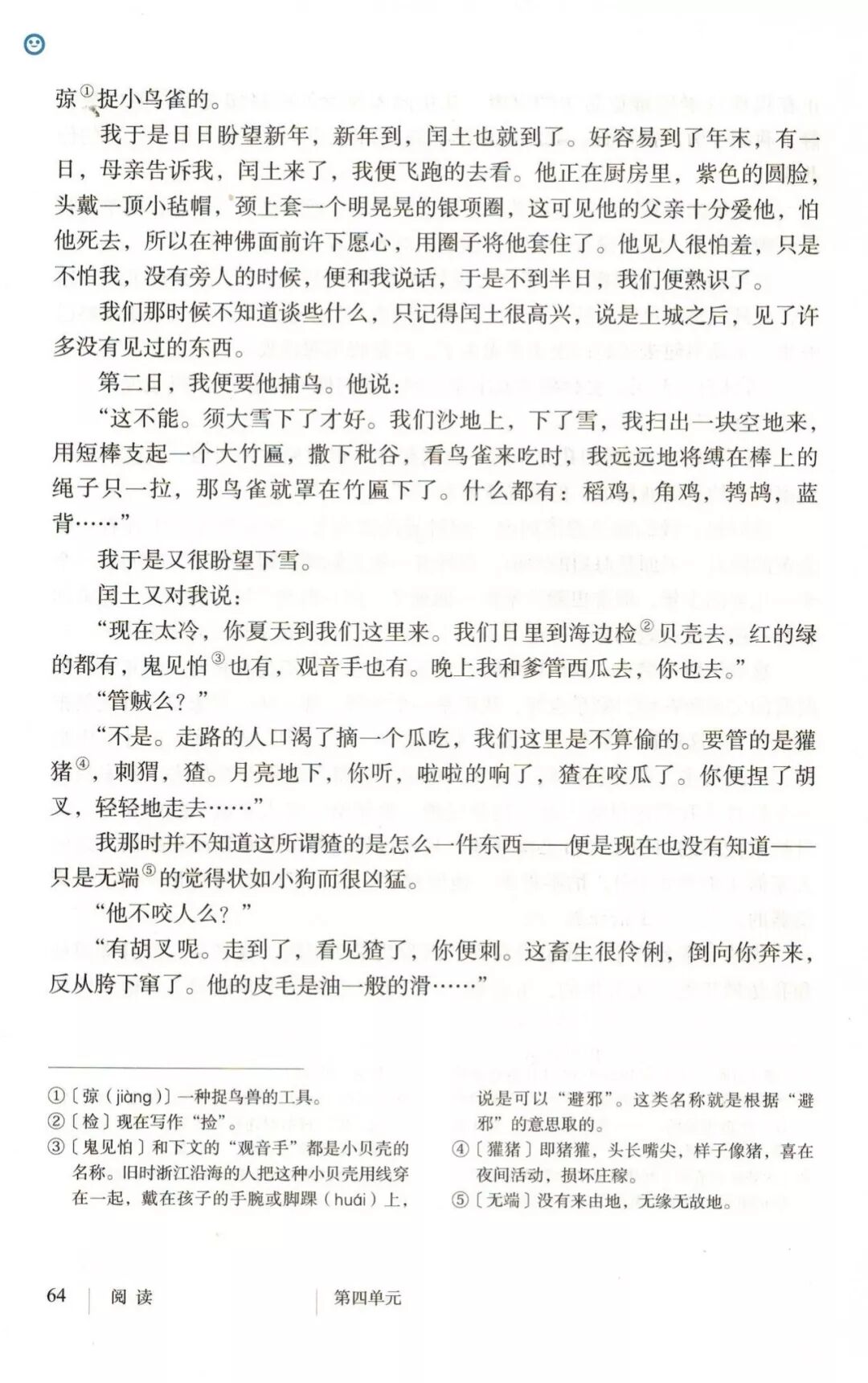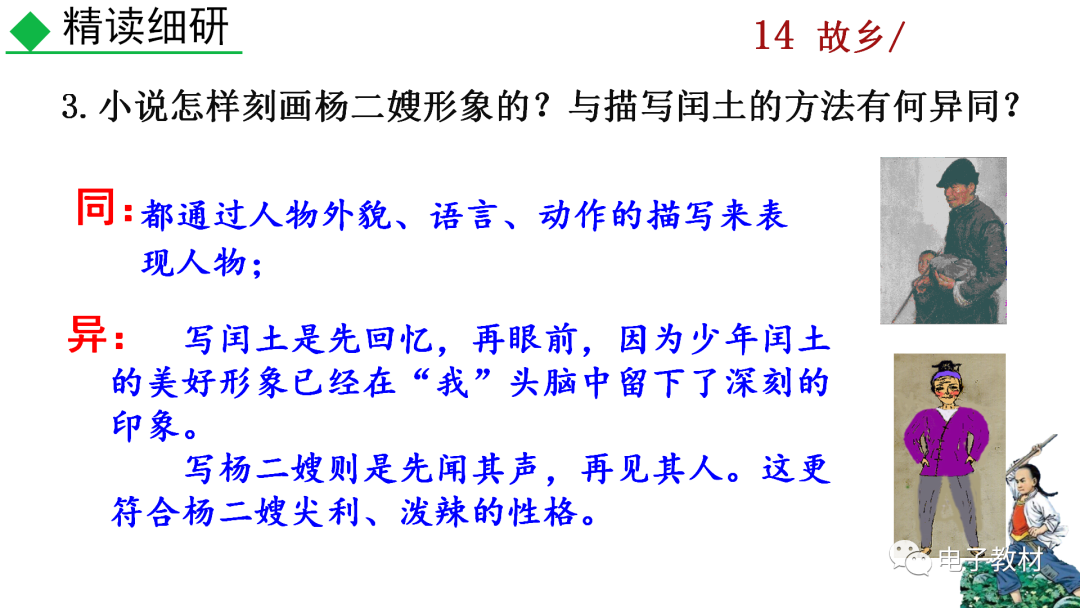 第一部分(6-77):写“我”在故乡的所见、所闻、所感。着重刻画了闰土与杨二嫂这两个人物形象。